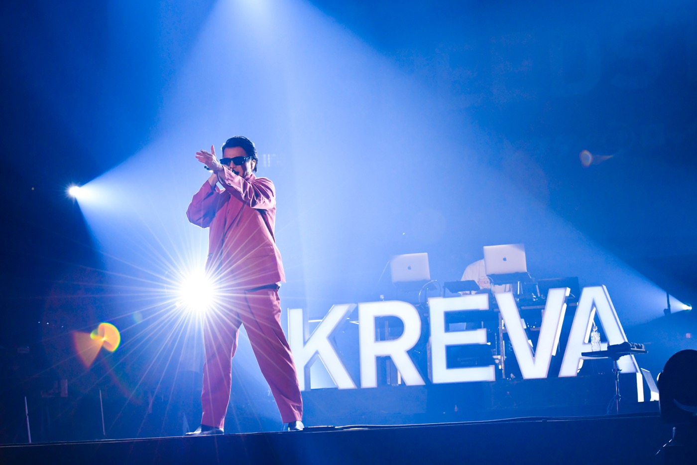 KREBandの演奏が華麗に鳴り響いたあと、ステージにKREVAが登場。「SPEEDSTAR、30周年おめでとうございます。その中でも新人の部類ですが、よろしくお願いします。KREVA! って呼んでもいいらしいよ。それだけで感無量。やっとだね。初めてライブを観る人、やっと会えたな」――素敵な言葉にさっそく胸が熱くなる。そしてサングラスを不敵に輝かせながら歌い始めた1曲目は「Finally」。2022年2月にリリースされたアルバム『LOOP END / LOOP START』でもオープニングを飾っていたこの曲は、粋なライミングが満載されている。こんなにも極上のラップを浴びたら、じっとしていられる人類がこの世に存在するはずもない。観客たちは体を揺らして踊り始めた。続いて「基準〜2019Ver.〜」も届けられたが、ビートを巧みに乗りこなしながら放つラップの切れ味が本当にすごい。“かっこいいラップとはこういうことだ!”と堂々と名乗りを上げるかのような姿に痺れてしまった。