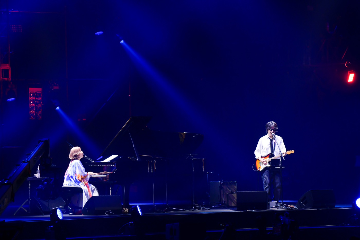 「幕張メッセ、初めて来ました。SPEEDSTARに拾っていただき、今年で10年になるんだそうです。次にやる曲を書いてくれたのはパット・メセニー。ご本人は歌われないので音域がものすごく広いです(笑)」――ウィットを利かせた紹介を経て披露された「PRAYER」も素晴らしかった。観客たちの心が静かに震えているのが肌で感じられる…。そして「今日、くるりのステージでも演奏されましたが、そんなことは構わず、矢野顕子もこの曲をやります(笑)」という言葉が和やかな笑いを誘ってから届けられたくるりのカバー「ばらの花」。この曲のあとに、岸田繁(くるり)がステージに呼び込まれた。「私たちの数多くのヒット曲から厳選したこの曲を(笑)。ふたりで書いたんでしたっけ?」(矢野)「はい。漫画喫茶で」(岸田)「漫画喫茶に行ったのはあとにも先にもあれが初めてです」(矢野)「いい仕事できたかなと」(岸田)「まだ漫画喫茶ってあるんですか?」(矢野)「あります。シャワーも浴びれますし」――ほのぼのとしたやり取りのあとに披露されたのは、ふたりの共作で2006年にリリースされた「PRESTO with 岸田繁」。岸田もアコースティックギターを弾きながら歌い、温かなハーモニーを響かせていた。