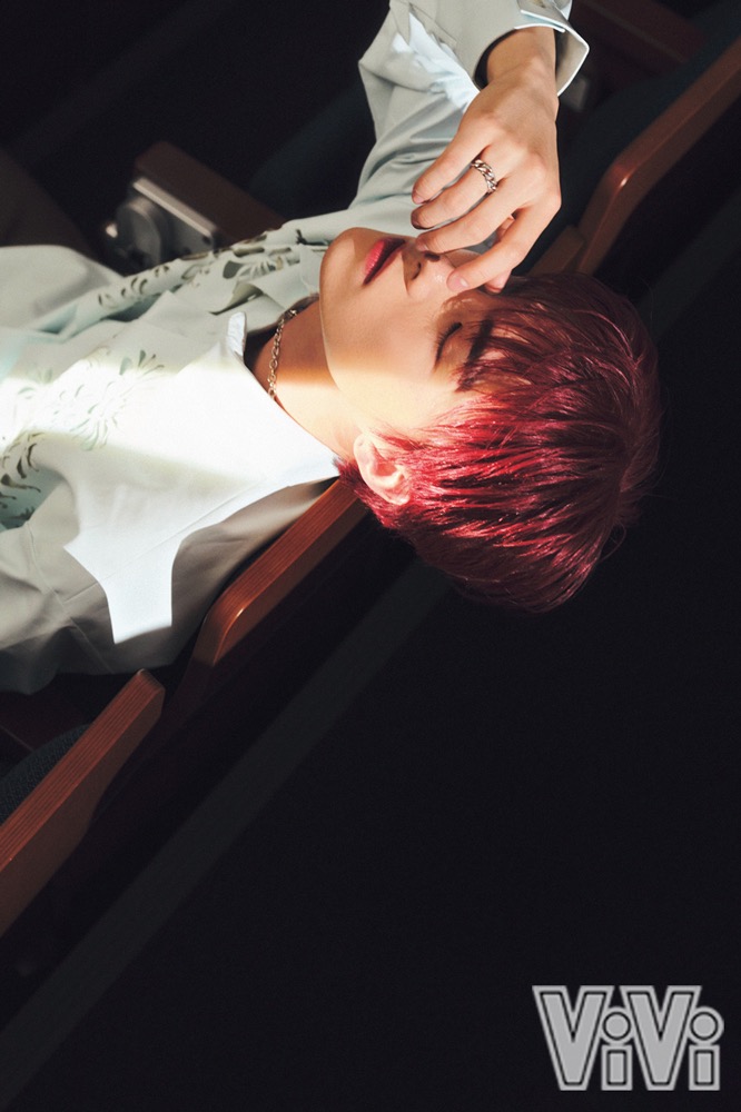 グループの活動に、ドラマ撮影に、とにかく忙しい川西。過密スケジュールの合間を縫って、たくさんの椅子が並んだ、とある会議室で撮影を敢行した。カジュアルなスウェットスタイルと、上品な水色のシャツスタイルの2ポーズを着こなし。カメラマンが撮影の意図を伝えると、「ハイ、わかりました! やってみます!」とハキハキ答える好青年さ全開の川西。持ち前のセンスと天才肌のせいか、川西がただ椅子に座って遠くを眺めているだけで、まるで会議室がシネマのような空間に。ViViスタッフたちも「そこに存在しているだけで、どんな場所でも絵になる」と、改めて“ヒトとしての強さ”を実感したとのこと。