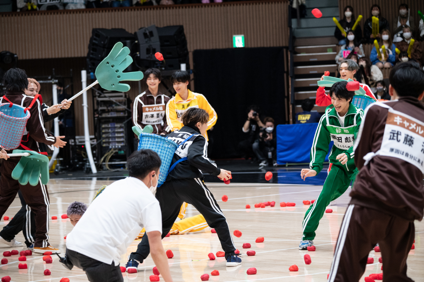 最初の競技は、4チームが同時に対戦する“背負いカゴ玉入れ”。カゴ役ひとり、玉が入るのを妨害する“お邪魔”役ひとり、相手チームのカゴに球を投げる役が4人という、各チーム6人ずつの出場で、髙田彪我とラブワンの相原一心という身長の高いメンバーを揃えたさくらしめじチームが見事に勝利。