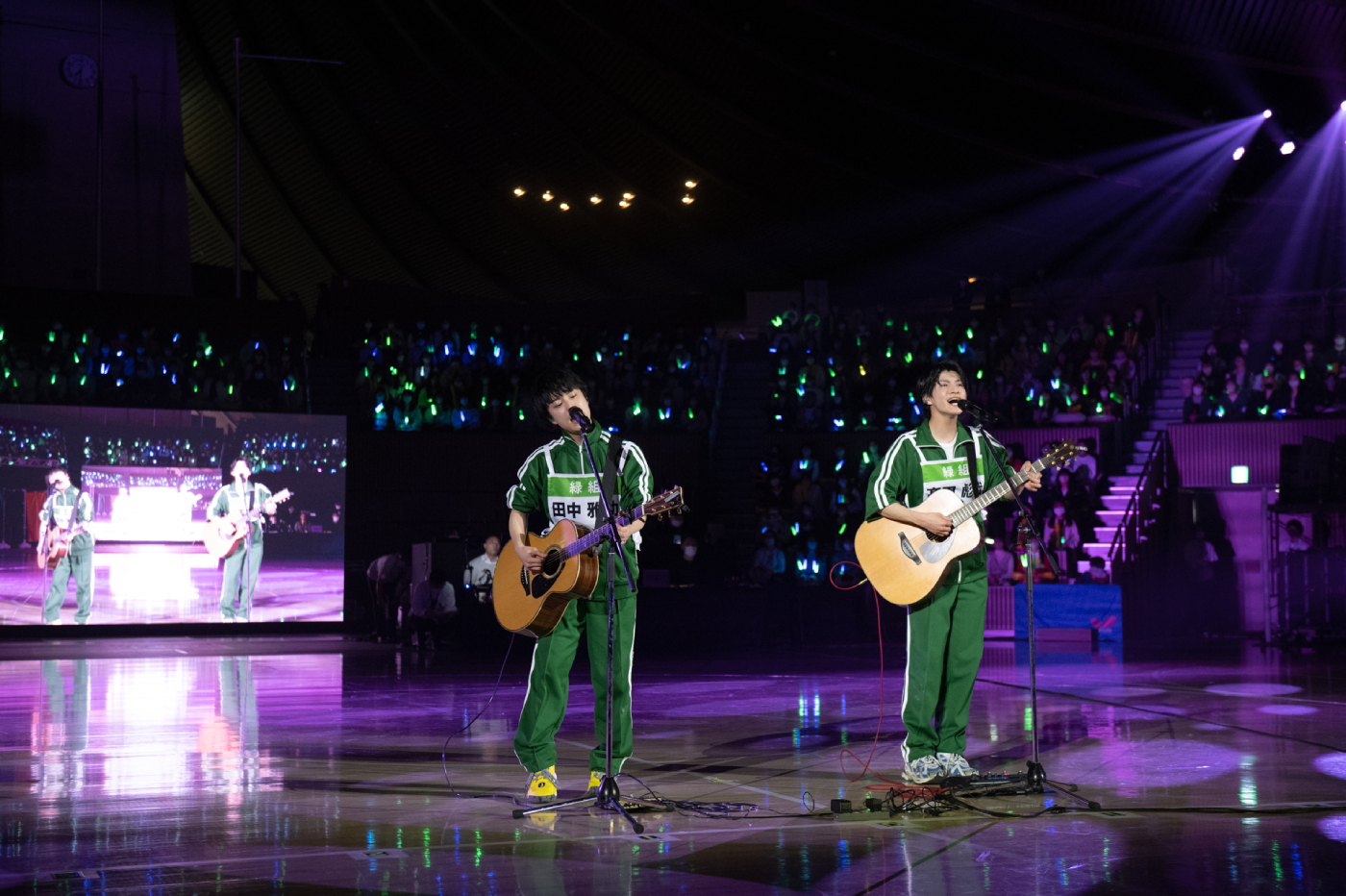 続いて、ワンエンのHAYATOとげんじぶの武藤潤が代表して選手宣誓を高らかに行い、大運動会は開幕。さくらしめじが朝礼台に登り、自身のオリジナル曲「しめじ体操」で準備体操を始めると、声出しが解禁された満員の客席からは、「可愛い!」の声が上がるなど、大歓声と割れんばかりの手拍子が沸き起こっていた。