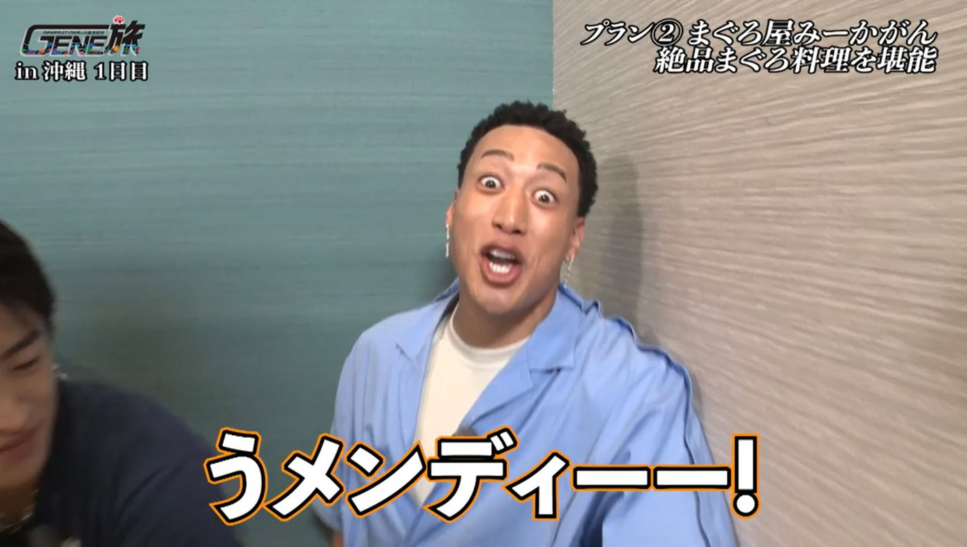 そして1日目のラストは、GENEが全員一致で泊まりたかったというオクマ プライベートビーチ&リゾートに宿泊。「GENE旅1日総括してどうでしたか?」と小森に振られたメンディーは大声で「イ~ヤ~サ~サ~!!」と答えた。