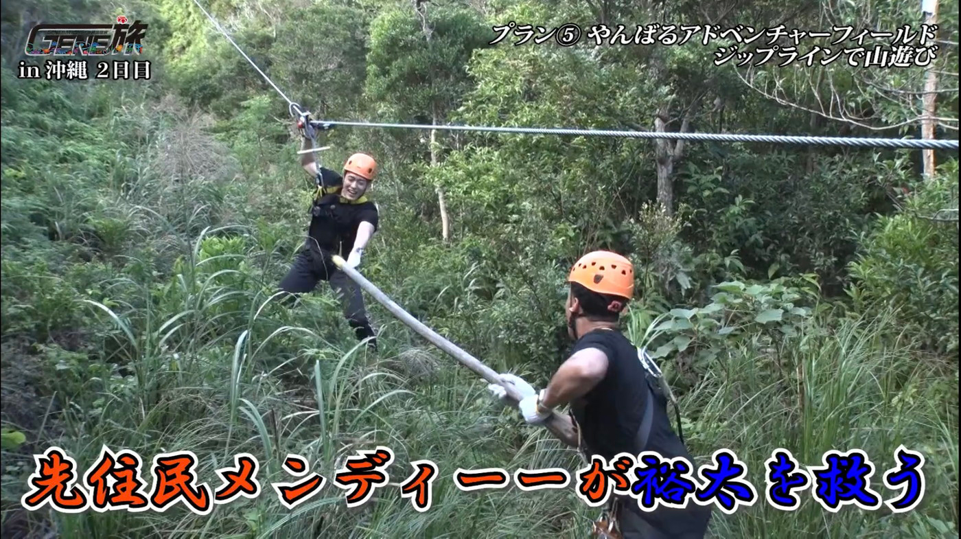 Part2(GENE旅2日目)ではやんばるアドベンチャーフィールドにてジップラインに挑戦。思っていた以上の高所に佐野は「めっちゃ怖い…」と怖気づくも「気持ちい~」とニコニコ。片寄涼太は絶叫しながら「たのすぃ~」と余裕の表情を見せ、白濱亜嵐は「すげー!」と景色に感動。トリのメンディーが滑り終わるとメンバーはどこかに隠れてしまい「誰もいないやん!」とキレて爆笑されていた。