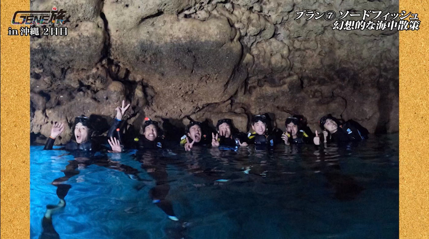 マリンアクティビティが体験できるお店のソードフィッシュに着くと7人は目的地の青の洞窟まで泳いで移動。青の洞窟には美しく神秘的な風景が広がり、その壮観さにメンバーは大興奮。いちばんの絶景ポイントに行くと7人は口を揃えて「青い!」と驚き、想像以上の景色に目を輝かせながら感動。神秘的な場所を見つけると全員で記念撮影も行った。