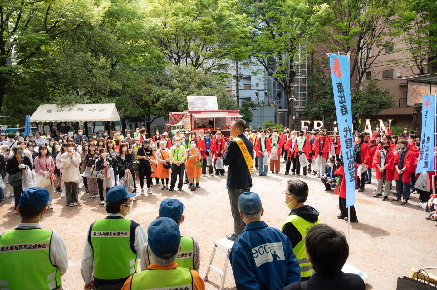 クリーンアップボランティアとして事前に申し込み、抽選で選ばれたEBiDANファン約80名は、当日、朝から恵比寿公園に集合。当初は参加しないと告知されていたEBiDANメンバーも駆けつけると、ファンからは喜びの声があがる。さらに、10時からのセレモニーでは渋谷区長をはじめ、渋谷警察、渋谷消防署、恵比寿駅(JR、東京メトロ)等の関係者が挨拶。日頃から清掃活動を行っている恵比寿地区町会連合会の人々も、EBiDANメンバーやファンを前に「こんなにたくさんの人が来たのは初めてで圧倒されています」と驚き、「清掃活動を楽しんでもらえれば」とエールを送った。