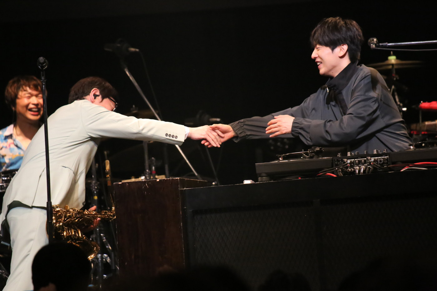 GAMOが「それじゃあ、Creepy Nutsの」と言おうとしたはずが、今度はGAMOがCreepy Nutsの名前を噛んでしまい、ステージ上のメンバーもオーディンスも大爆笑。谷中が「さっきのとおあいこですね」と言うと、GAMOとCreepy Nuts のふたりがステージ上で固い握手を交わした。