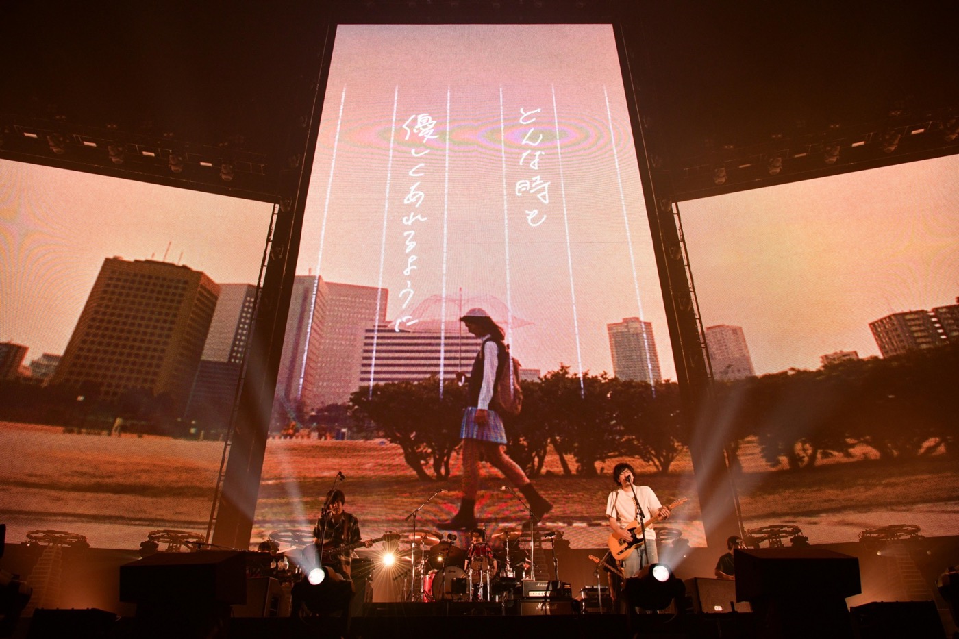 “お洒落ではないけど 唯一のダサさで/君が笑えたらいい”――ライブの冒頭、清水依与吏(Vo&Gu)がテレキャスターの弾き語りで歌い始めたのは「アイラブユー」の一節だった。NHK連続テレビ小説『舞いあがれ!』の主題歌として日本全国で親しまれた名曲が、満場の期待感を真っ向から抱き止めるように強く優しく響いた。