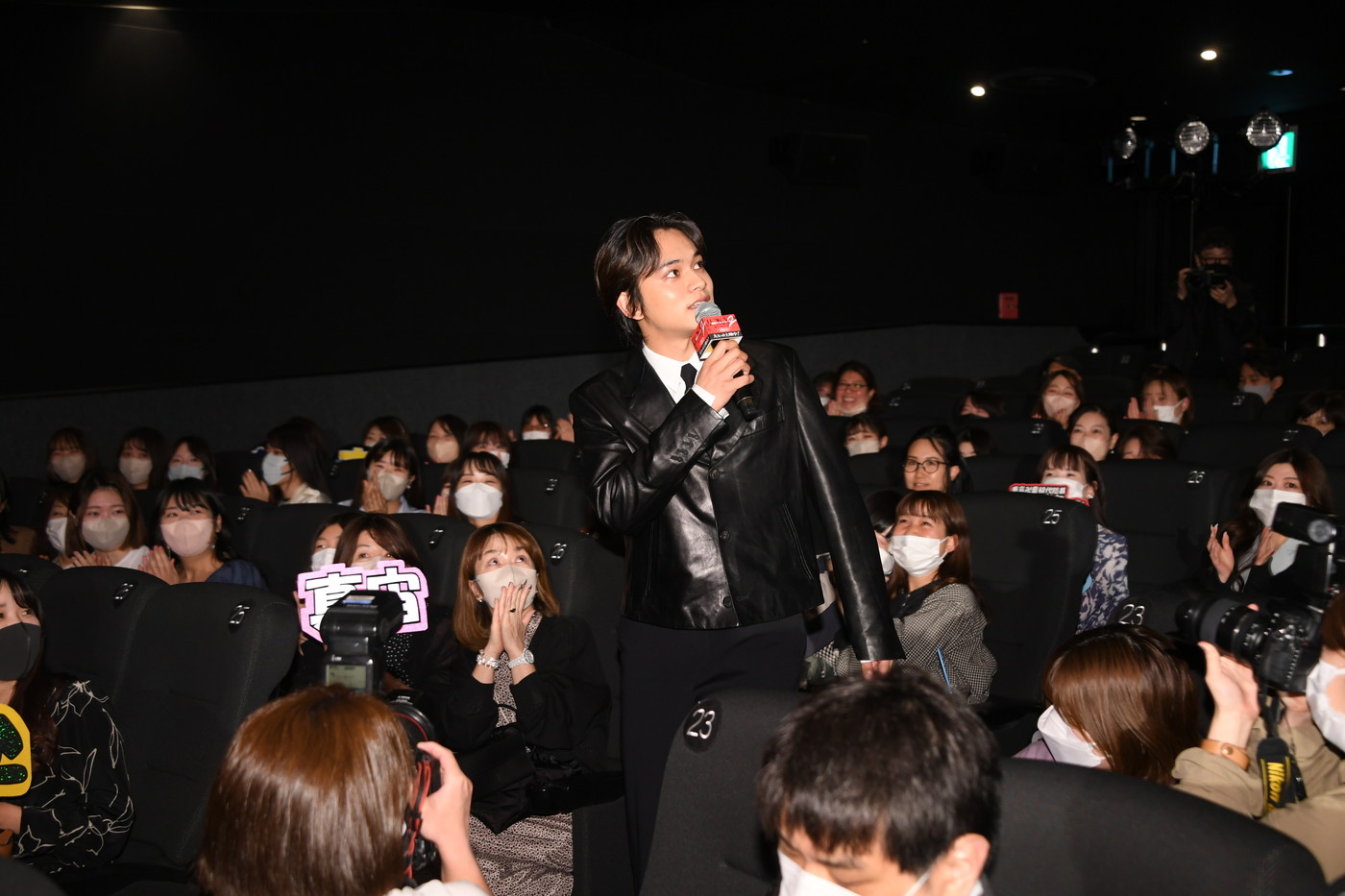 悲鳴にも近い歓声が起こると、「みんな気づかないね!(笑) 実はここで一緒に映画を観ていました!」とサプライズでお客さんと一緒に鑑賞していたことを報告。会場の熱気やお客さんの熱量を間近で感じながら、ステージへ登壇した。