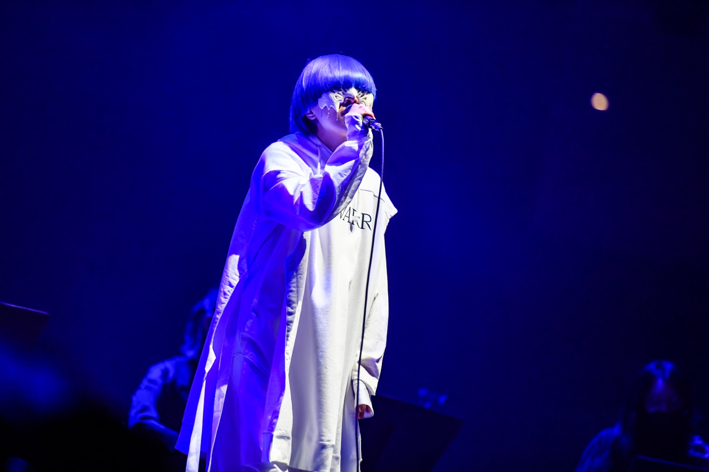 と、出て来ていきなり、これまでパフォーマンスを披露したアーティストの名前で韻を踏みながら、会場に投げかけた。そして観客に手を挙げるよう呼びかけ、「数え唄」を披露。Creepy Nutsと観客全員で指折り数え、1曲目から観客の心をつかみ、会場の熱を一気に盛り上げると、勢いのままに「よふかしの歌」へ。コール&レスポンスが盛んに行われ、声出しが解禁されたライブシーンを象徴する、ステージと観客が一体となった瞬間になった。