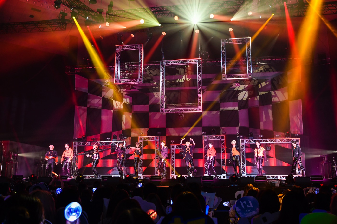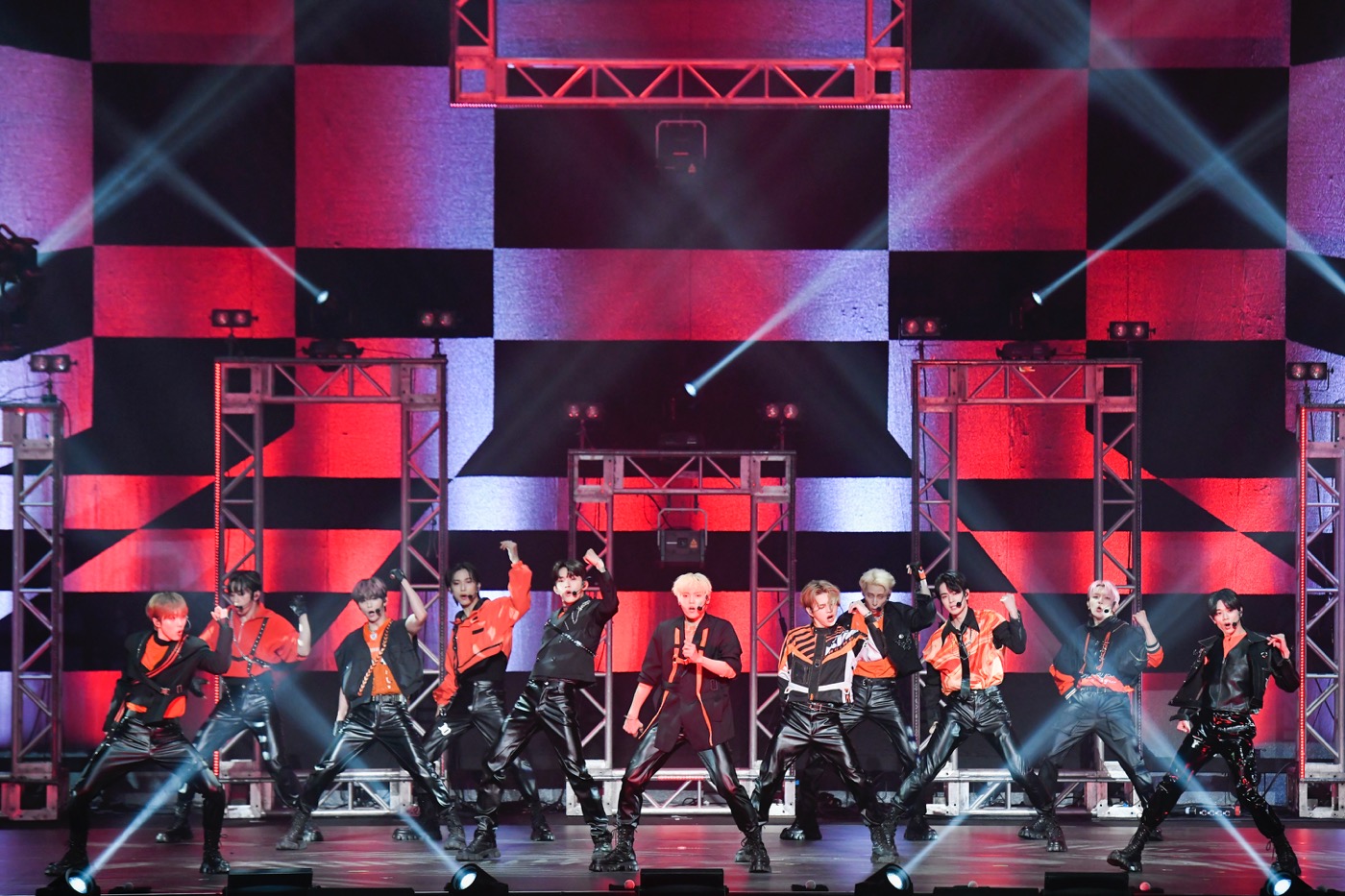 赤と黒を基調とした衣装に身を包んだINIが登場。登場するやいなや、詰めかけたファンの大歓声で会場のボルテージは一気に最高潮に。冒頭、人気曲「Rocketeer」「BOMBARDA 」「SPECTRA 」を続けて披露。ファンに掛け声を求め、会場と一体となったパフォーマンスを展開した。