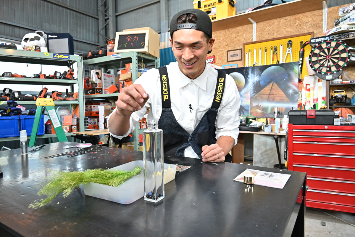 講師の関羅夢氏から“瓶の中に物語をイメージして作ること”がコツと聞き、槙野は折り鶴、小山は赤色と青色の紫陽花、加藤はピンク色の花びらなどを使って母親への想いや思い出を詰め込んだ作品を制作していく。