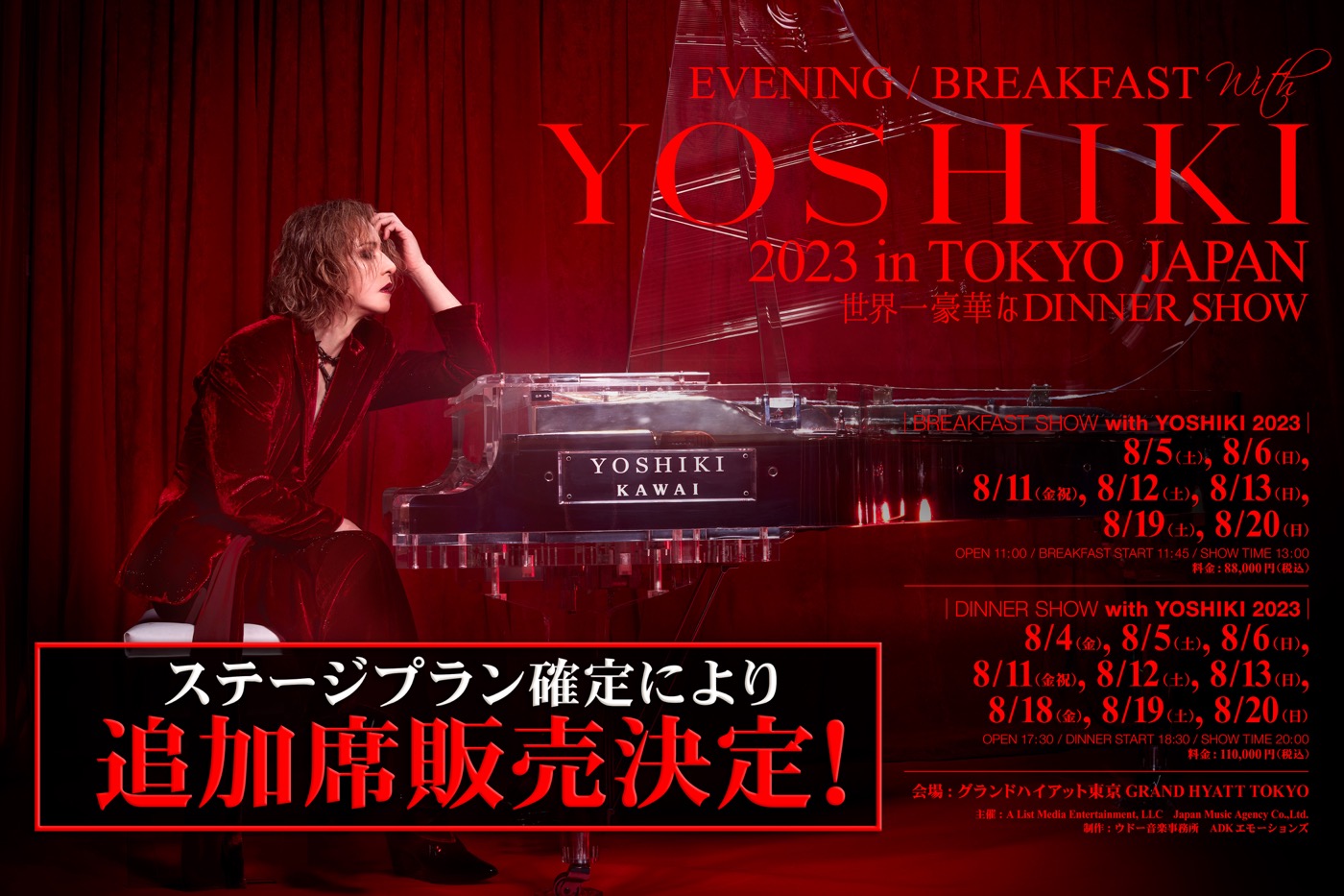 YOSHIKIが8月4日より開催する『EVENING / BREAKFAST with YOSHIKI 2023 in TOKYO JAPAN 世界一豪華なDINNER SHOW』のチケットが、ステージプラン確定により5月17日15時から一般先着(国内&海外)にて追加販売されることが決定した。