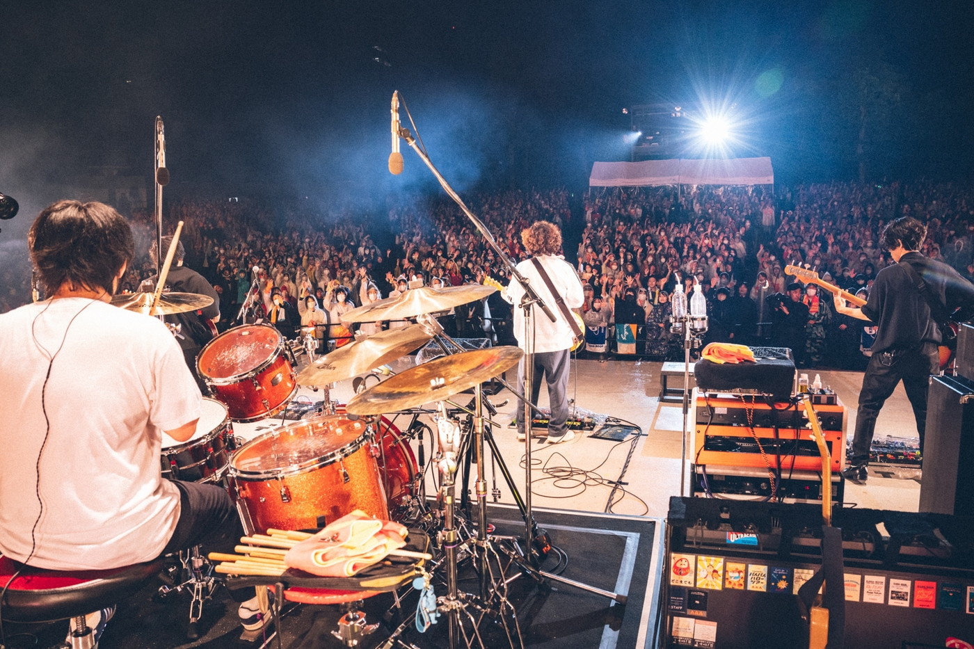 「ユーエスタス」を終えて谷口は客席に「桜は好きですか?」と問いかける。KANA-BOONには「さくらのうた」という名前の曲が3曲ある。その中からまず披露されたのは「桜の詩」。切ないメロディがじんわりと心に染み込むようだ。続けて2023年3月に配信リリースされた最新の桜ソング「サクラノウタ」へ。ピンクのライトが夜に近づく日比谷にひと足遅れた春を連れてきた。「KANA-BOON夜の部へようこそ!」。そんな谷口の言葉を合図に小泉がマーチングドラムを高らかに鳴らす。「夜のマーチ」だ。ここからは「スーパームーン」「夜をこえて」と「夜」をテーマにした楽曲を立て続けにパフォーマンス。谷口は「KANA-BOONには夜の曲が多い」と言っていたが、孤独と切なさを抱えた夜につぶやくひとりごとのようなそれらの曲は、雨が降る野音にとてもよく似合っていた。だが、たとえば1stアルバムからの「夜をこえて」などはそれだけではない強さも感じさせる。古賀ののびやかなギターも頼もしく、様々なことを乗り越えて前に進み続けてきた彼らの歩みを証明するような響きをもっていた。