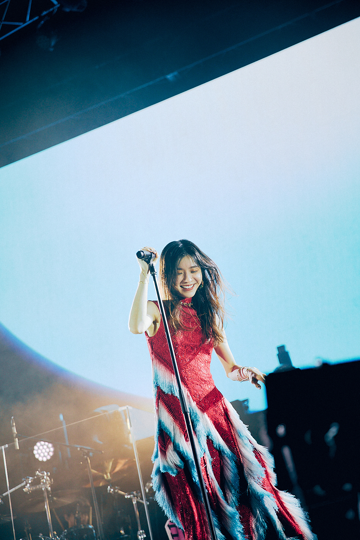 中盤戦のなかでも大きな印象を残したのは「inside you」。「当時、まだ誰が聴いてくれるか分からなかったこの曲が今は皆さんがいるから届けたい曲になりました。私の始まりの曲です」と添えられ静かに始まった同曲。2サビ以降では、レーザー照明が激しく飛び交う演出となっており圧巻のパフォーマンスであった。