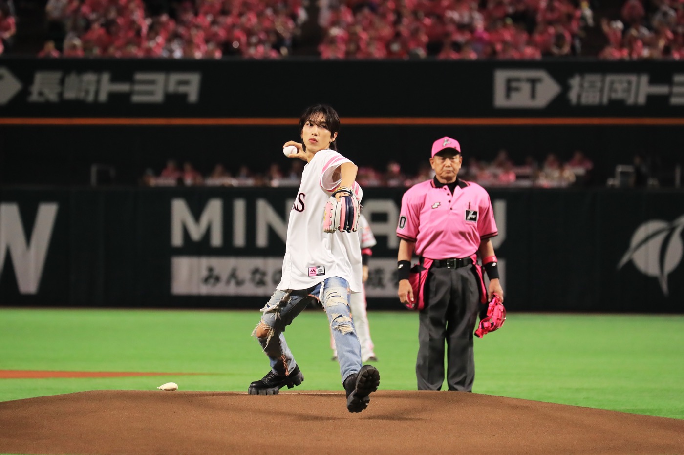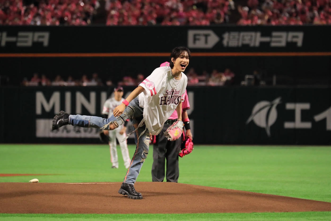 そして、メンバーを代表し、福岡県出身の池﨑理人による人生初の始球式が行われ、緊張が伝わるくらい力強く投げるも大暴投。捕手を務めた甲斐拓也選手もキャッチできず。投げ終わった後はキャッチャーの後ろで見守る10人のメンバーや会場内の観客一同拍手が沸き起こった。
