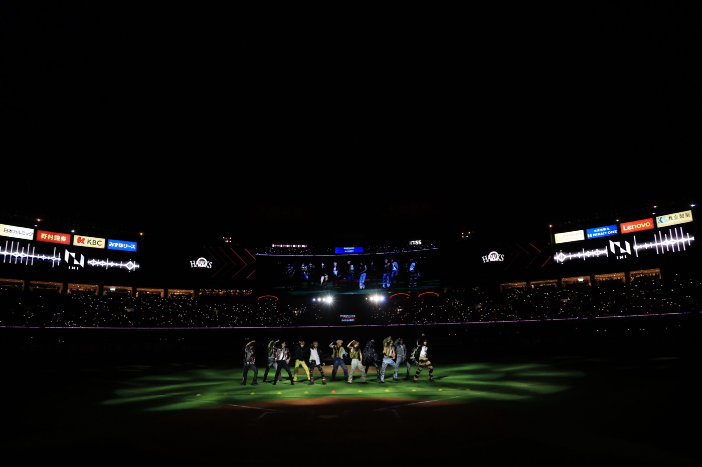 ホークスの勝利で収めた試合終了後、INIは応援ゲストとして再度登場。福岡PayPayドームに集まった約4万人のプロ野球ファンの前で、5月24日にリリースする4thシングル「DROP That」より「FANFARE」を披露した。