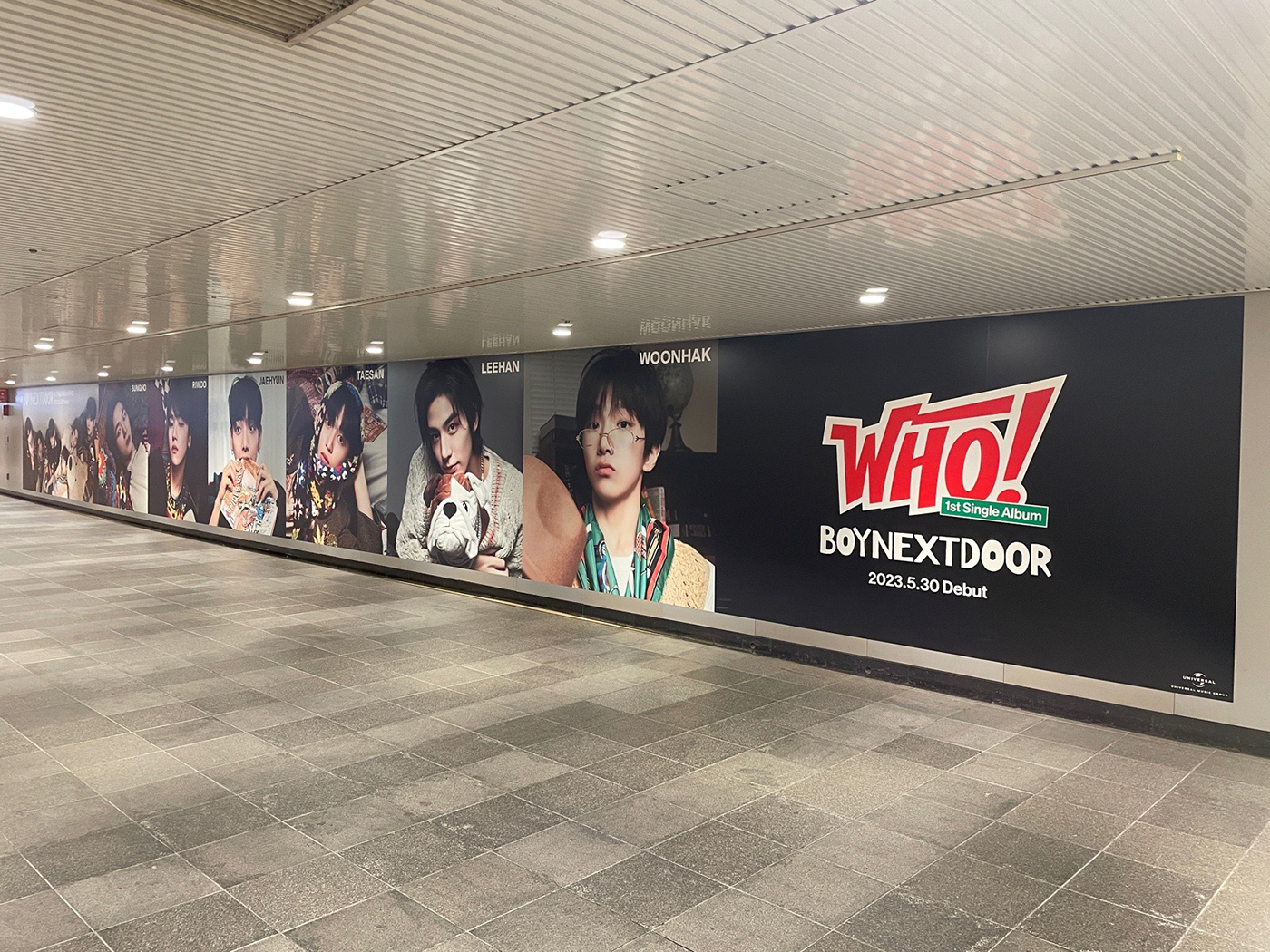 BOYNEXTDOORが1stシングル「WHO!」を5月31日(韓国では30日)にリリース。これを記念して5月22日から28日まで、東急田園都市線渋谷駅のB1FのA0、A1出口方面コンコースに、全長約22メートルにもわたる、BOYNEXTDOORの巨大ポスターが掲出されている。