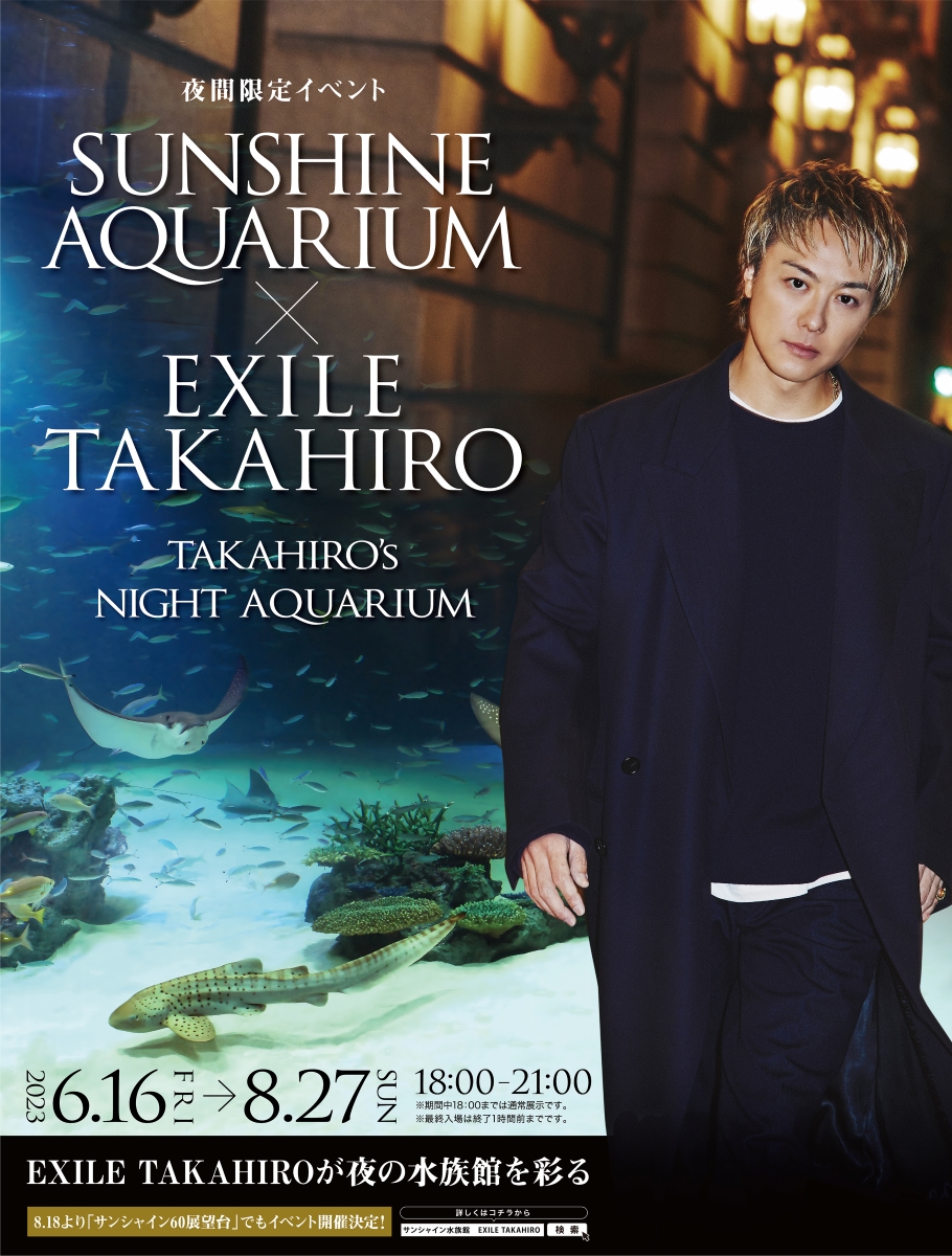 EXILE TAKAHIROが、サンシャイン水族館とのコラボイベント『サンシャイン水族館×EXILE TAKAHIRO ~TAKAHIRO’s NIGHT AQUARIUM~』を6月16日から8月27日までの期間、18時以降に開催することが決定した。