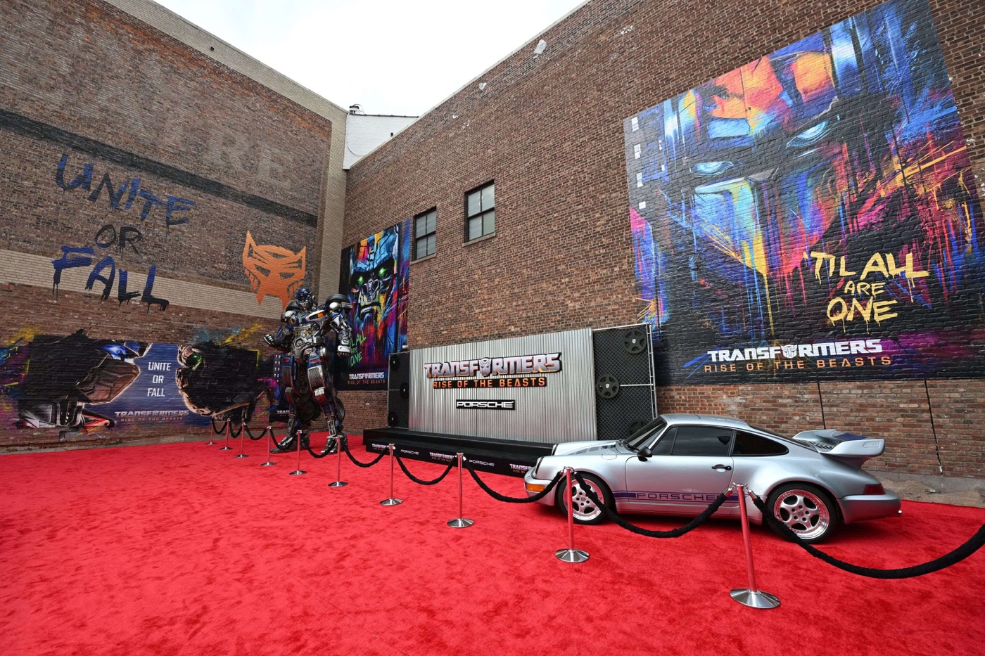 プレミアが開催されたのは、物語のはじまりの舞台であるニューヨーク・ブルックリンに位置するキングスシアター。会場には本作の公開を祝うべく一面にレッドカーペットが敷かれ、さらにブルックリンの町並みを模して作られたレンガの壁には、オプティマスプライムと、オプティマスプライマルのブルックリンらしい鮮やかなグラフィティが描かれ、主人公ノアとヒロインのエレーナたちが暮らす劇中の世界が体現された。そこへ主人公ノアとともに敵に立ち向かっていくシリーズ初登場のトランスフォーマーのミラージュの巨大モニュメントと、ミラージュのトランスフォーム前の姿である銀色に輝くポルシェが配置されるほか、オートボットたちとビースト戦士のマクシマルたちが勢ぞろいした大迫力のビジュアルも掲出され、会場はトランスフォーマー一色に!会場には現地のアメリカを始め、各国からのジャーナリストたちが集まり、いよいよ公開を迎える本作への期待度と本作ではじめて描かれるビーストウォーズの人気度の高さを物語っていた。