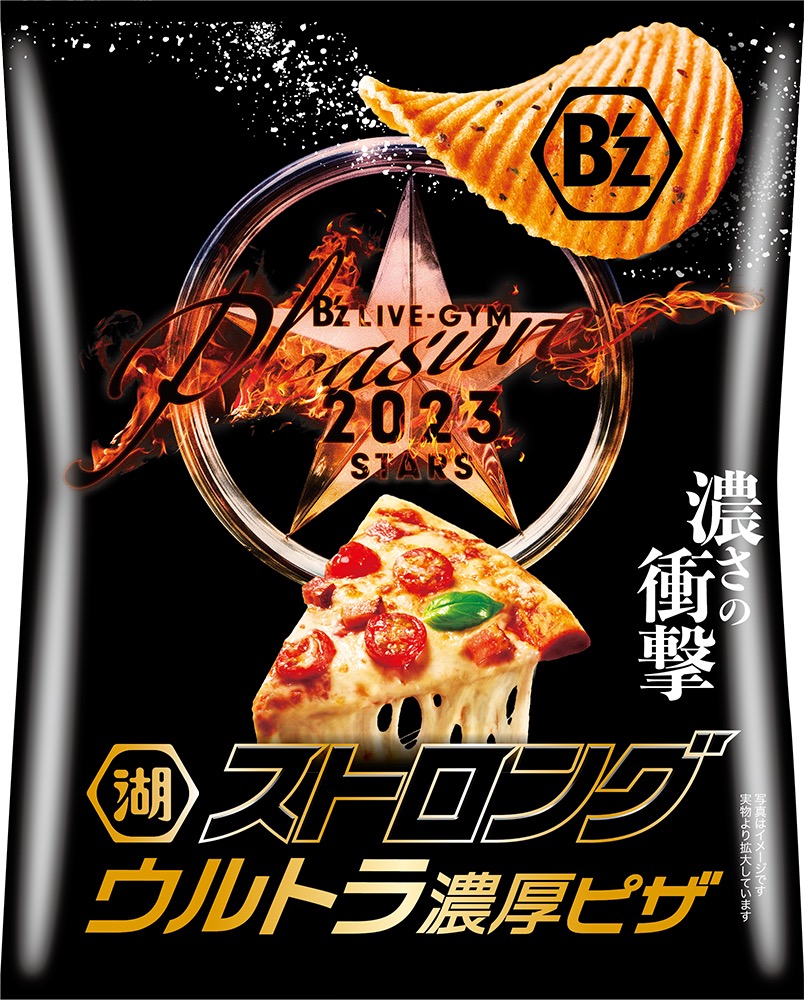 B’zと“湖池屋ストロング”ブランドがコラボレーションした“湖池屋ストロング ポテトチップス ウルトラ濃厚ピザ”が、6月17日から開催されるB’zの全国ツアー『B’z LIVE-GYM Pleasure 2023 -STARS-』の会場限定で発売されることが明らかとなった。