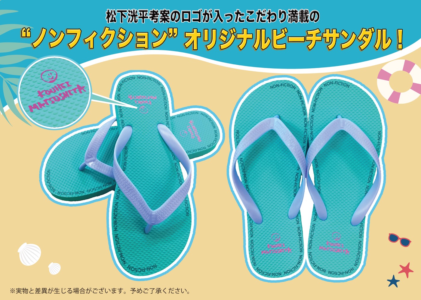 さらに、今作のリリース発表時から話題となっていたVICTOR ONLINE STORE限定盤のビーチサンダルの詳細も合わせて発表された。グリーンのサンダル本体にパープルの鼻緒という色合いに、サンダル全体を囲むように配置されたNON-FICTiONの文字と、松下洸平考案のピンクのロゴが目を引くデザインで、男女問わず使用できるオシャレなデザインとなっている。
