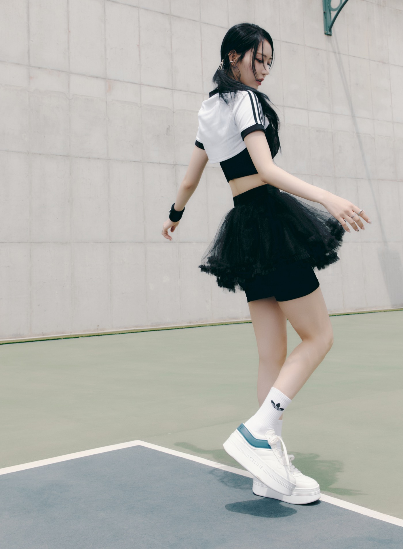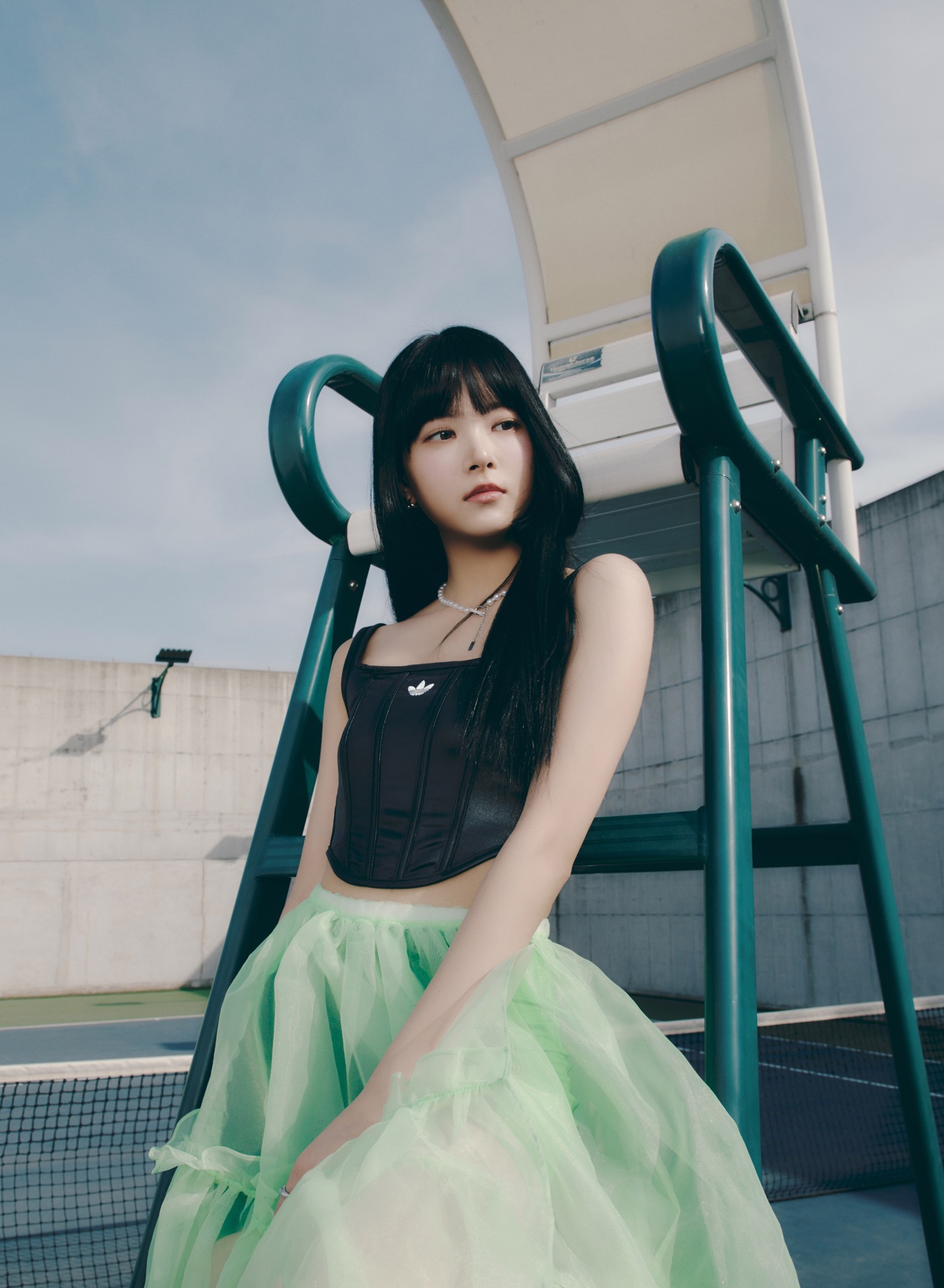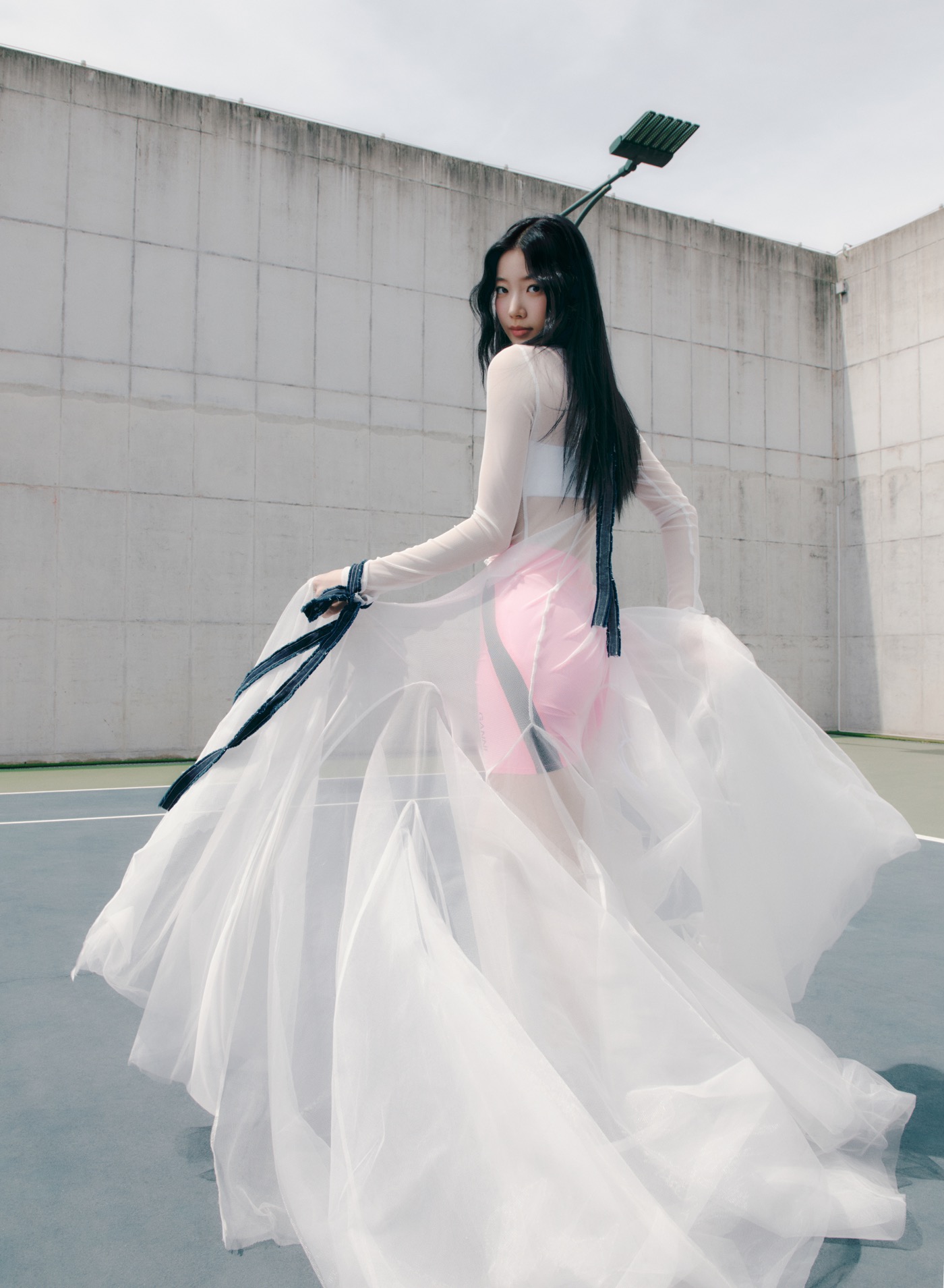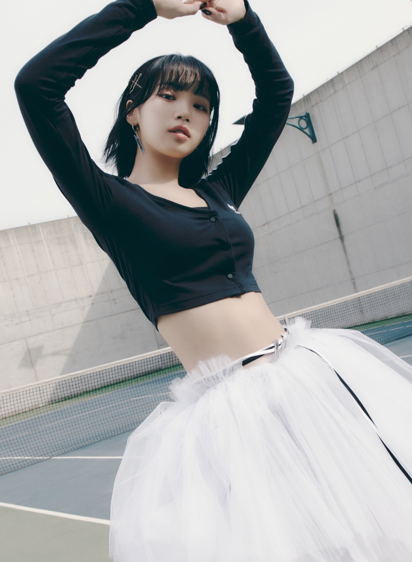 AIRY BLOOMコンセプトは、アクティブなテイストに花のように華やかなドレスをミックスしたスタイリングを身に纏い、自由に動きまわるイメージを表現。LE SSERAFIMの魅力である健康美と固定観念にとらわれない威風堂々とした強さが感じられるビジュアルとなっている。