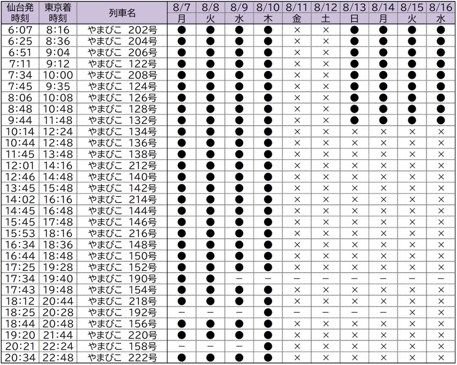 ※上段が下り(東京発仙台行き)、下段が上り(仙台発東京行き)