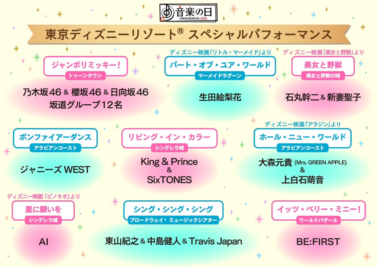 出演:AI、INI、あいみょん、ano、いきものがかり、生田絵梨花、石川さゆり、石丸幹二、AKB48、江口洋介、Aimer、&TEAM、ENHYPEN、織田哲郎、KAT-TUN、上白石萌音、関ジャニ∞、Kis-My-Ft2、KinKi Kids、King & Prince、倉木麻衣、クリス・ハート、Kep1er、郷ひろみ、PSYCHIC FEVER、櫻坂46、THE RAMPAGE、三代目 J SOUL BROTHERS、JO1、GENERATIONS、s**t kingz、島津亜矢、ジャニーズWEST、湘南乃風、SUPER BEAVER、SixTONES、Snow Man、SEKAI NO OWARI、Sexy Zone、ソニン、Tani Yuuki、DA PUMP、DXTEEN、DISH//、TOMORROW X TOGETHER、Travis Japan、中川晃教、中西保志、長渕剛、なにわ男子、新妻聖子、NiziU、NewJeans、NEWS、乃木坂46、BE:FIRST、東山紀之、日向坂46、ブルーベリーソーダ、Hey! Say! JUMP、MAZZEL、マカロニえんぴつ、MISIA、Mrs. GREEN APPLE、宮野真守、優里、唯月ふうか、Little Glee Monster、Little Black Dress、LE SSERAFIM、Rockon Social Club