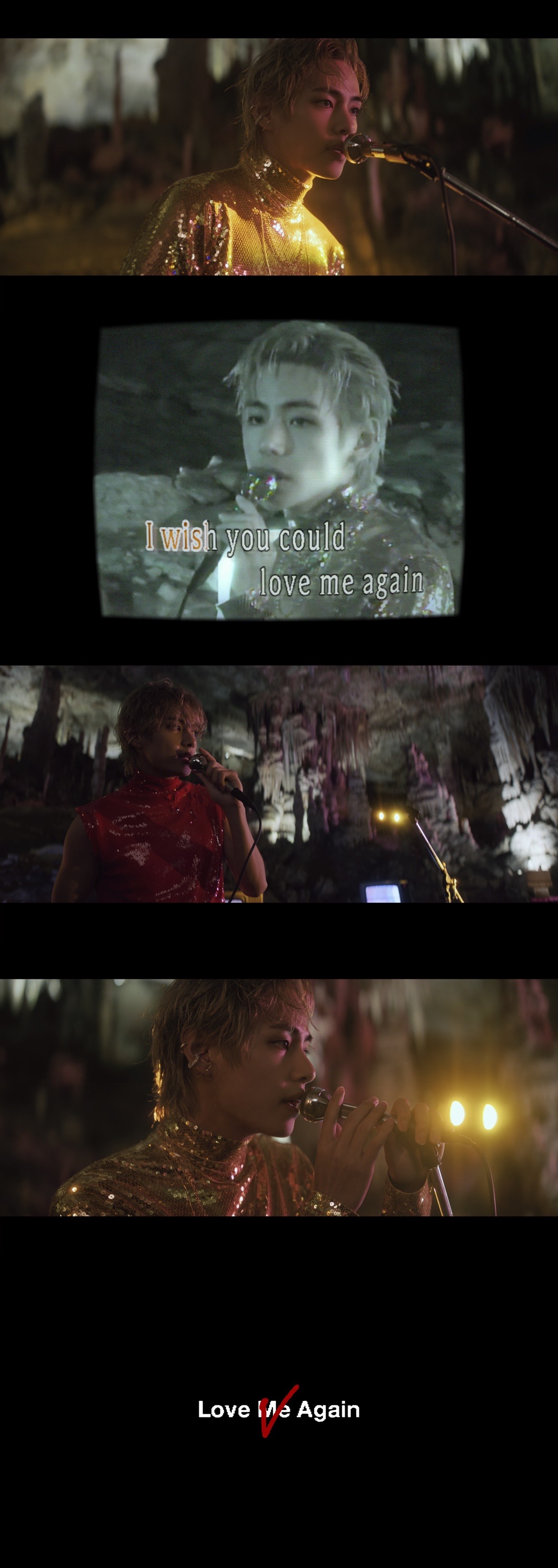 今回の映像はスペインのマヨルカにある洞窟にて撮影されたもの。洞窟の神秘的な雰囲気と、低く響きわたるVの音色が調和し、独特なムードの映像が完成した。 カメラは歌唱するVにフォーカス。金髪の美少年に変身した彼は、目つきと感情表現だけで画面を埋め尽くした。