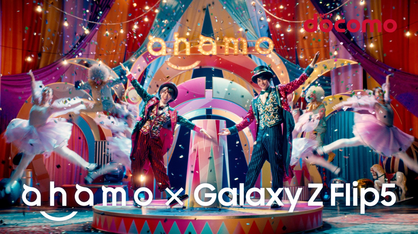 本TVCMでは、ahamo×Galaxy Z Flip5のカラフルかつファンタジーな世界観をサーカスショーで表現。森と神尾が煌びやかな衣装で登場し、カラフルな空間で新商品“Galaxy Z Flip5”の機能やahamoのスペックを楽しく披露する。