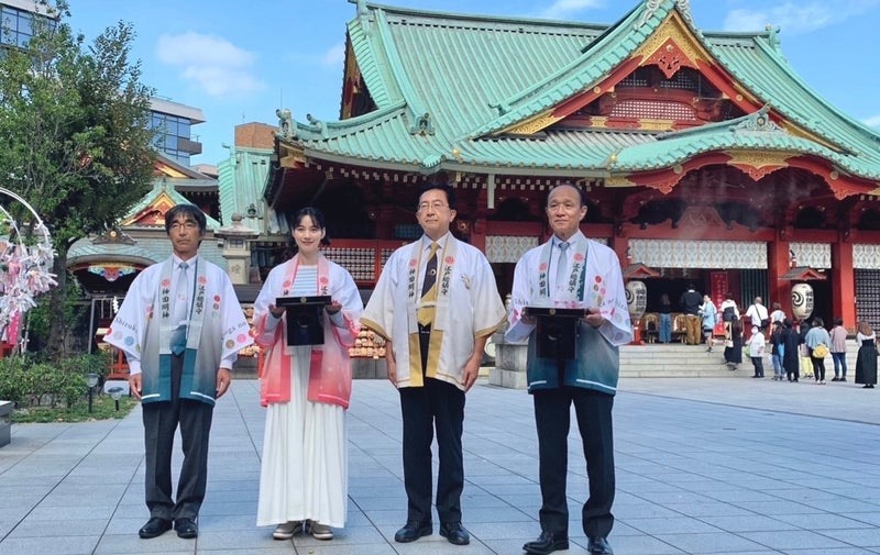 と同発表会について触れ、神田明神をバックに岩手県の達増拓也知事、全国農業協同組合連合会岩手県本部運営委員会の伊藤清孝会長、同・岩手県本部長・高橋本部長との記念写真を公開。