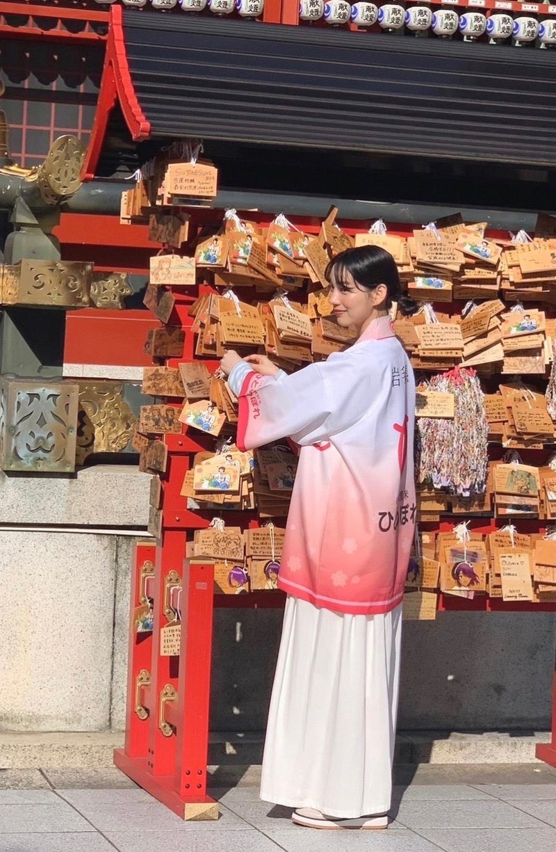 「今日は、いわて純情米新CM発表会でした。その後、絵馬に願い事を書いて神田明神にご祈祷しました」