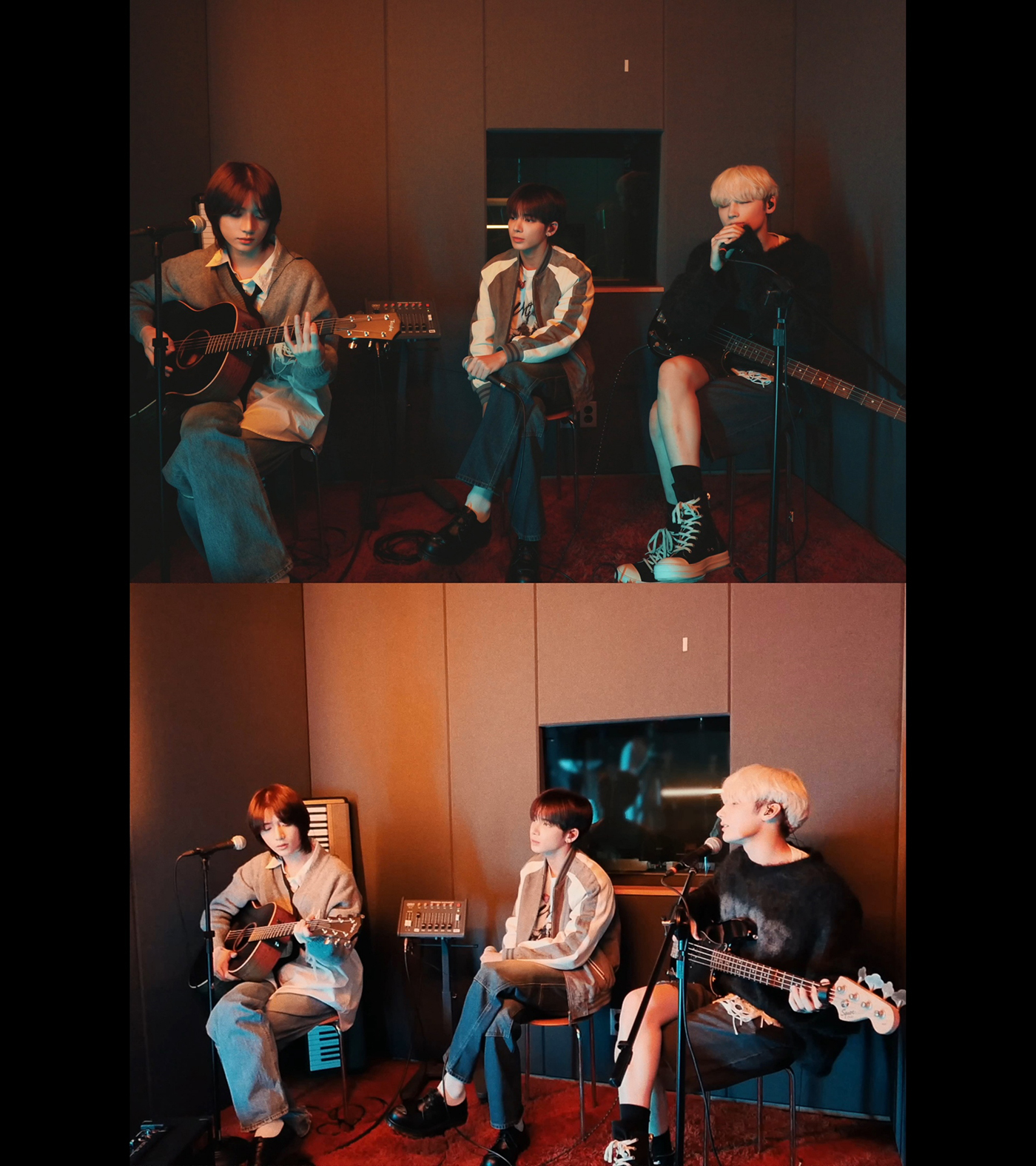 3人はシンプルなセットのレコーディングブースで「Skipping Stones」を披露。 BEOMGYUとHUENINGKAIは、それぞれギターとベースも演奏。3人の力強いボーカルが、叙情的な歌詞と調和して癒しを与える。