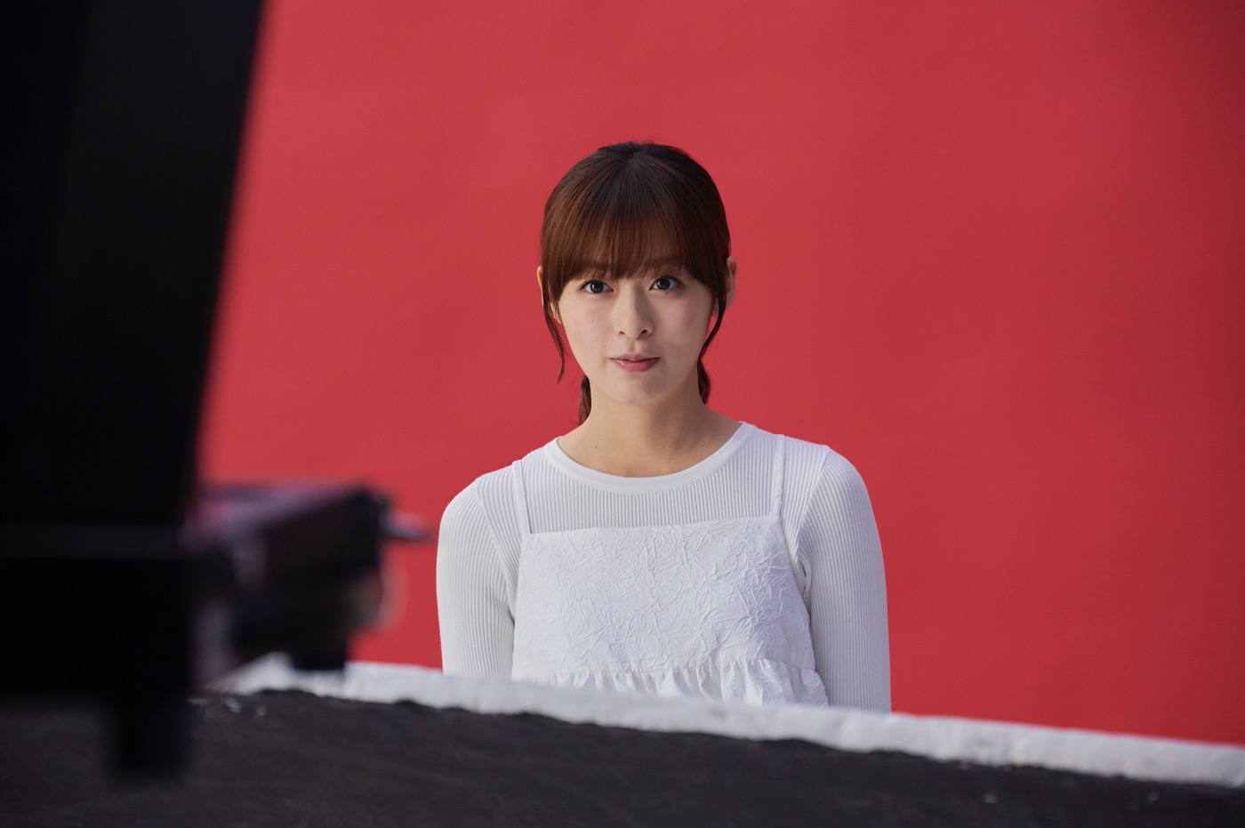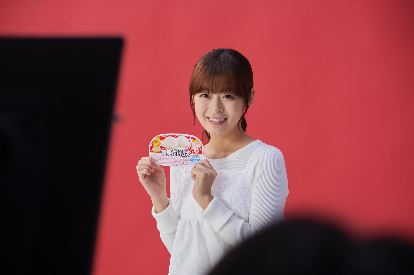 「よろしくお願いします!」と、“雪見だいふく”のような真っ白な衣装を身にまとい、撮影現場に入った森。“もちなな”の愛称でも知られる森。“雪見だいふく”の弾むようなぷにぷにさを、自身のほっぺたをぷにぷにと押して表現する“ぷにぷにポーズ”の撮影がスタート。