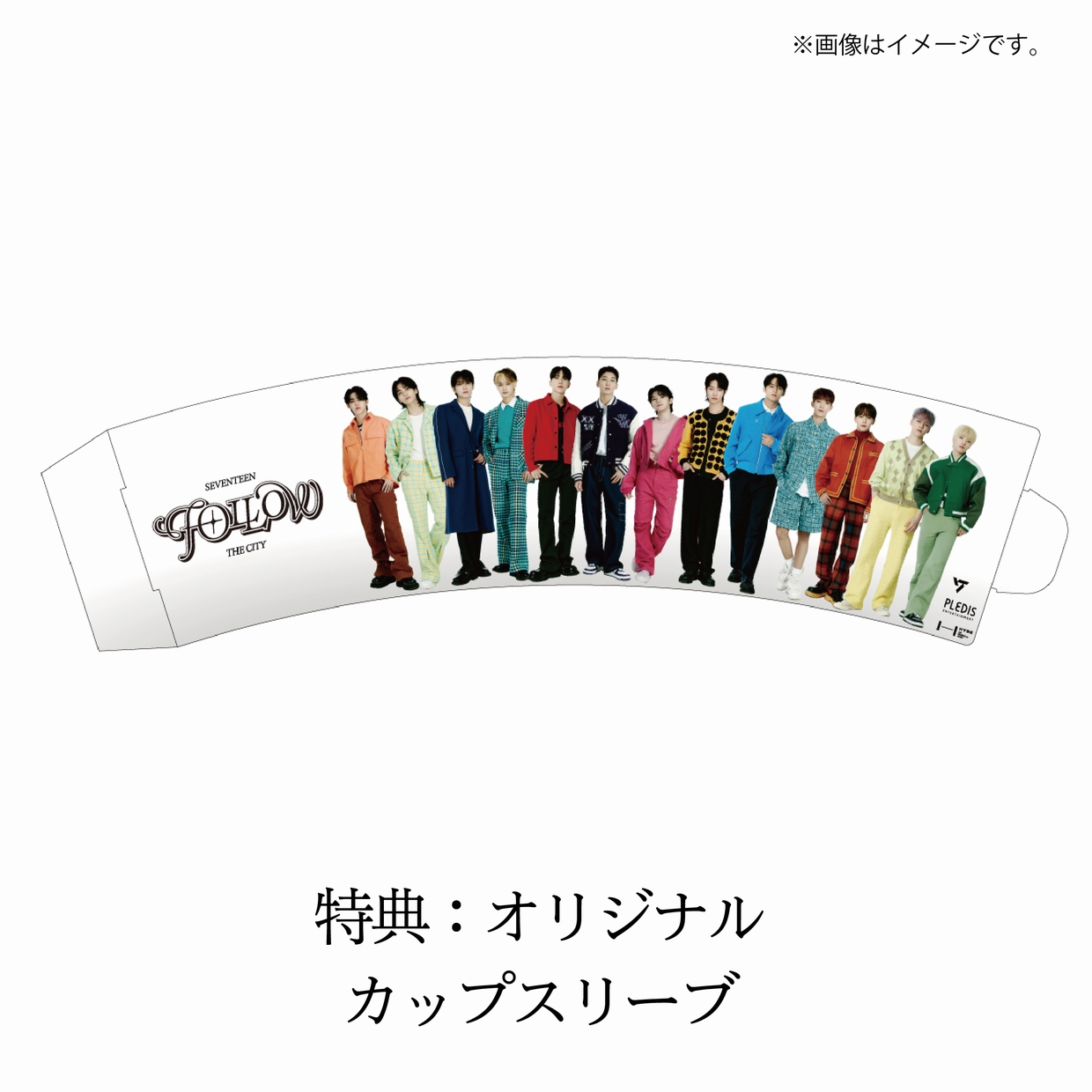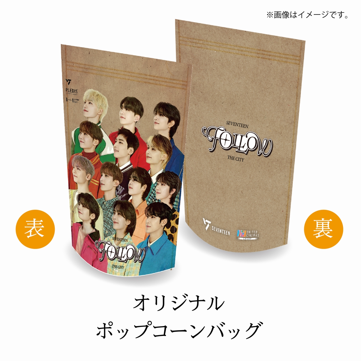 また、『SEVENTEEN TOUR ‘FOLLOW’ TO JAPAN』のライブビューイング上映劇場では、映画鑑賞に欠かせないポップコーンセットを『SEVENTEEN TOUR ‘FOLLOW’ THE CITY』とのコラボパッケージで販売。ポップコーンセットのパッケージ、特典のオリジナルカップスリーブのデザインも公開された。