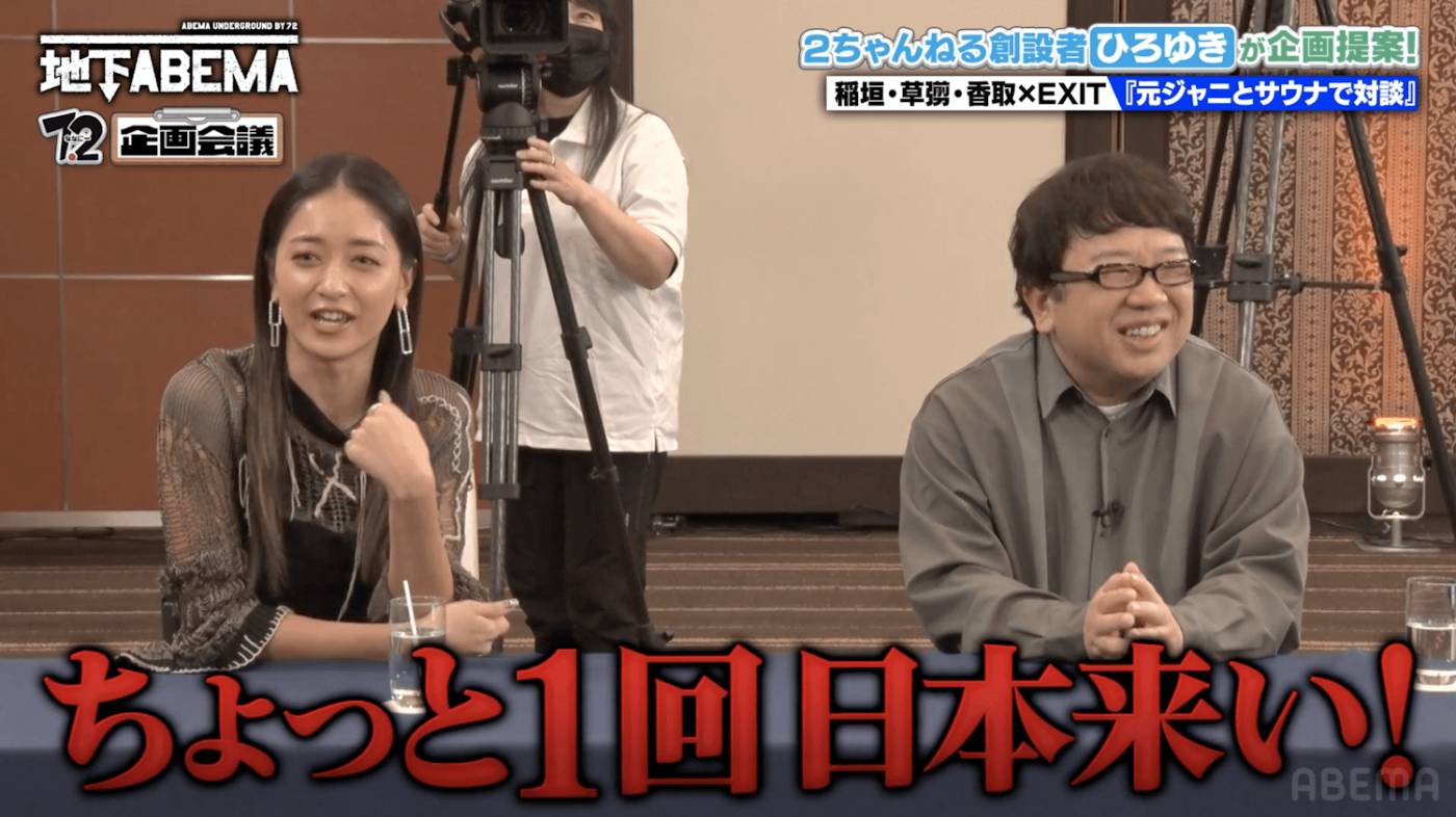 番組の冒頭では、ひろゆきが、ななにーメンバーに本番組がヒットを生み出すための企画を発表。歯に衣着せぬ発言で人気のひろゆきさんの口から飛び出した企画は、なんと「稲垣・草なぎ・香取×EXIT、元ジャニーズとサウナで対談」というもの。