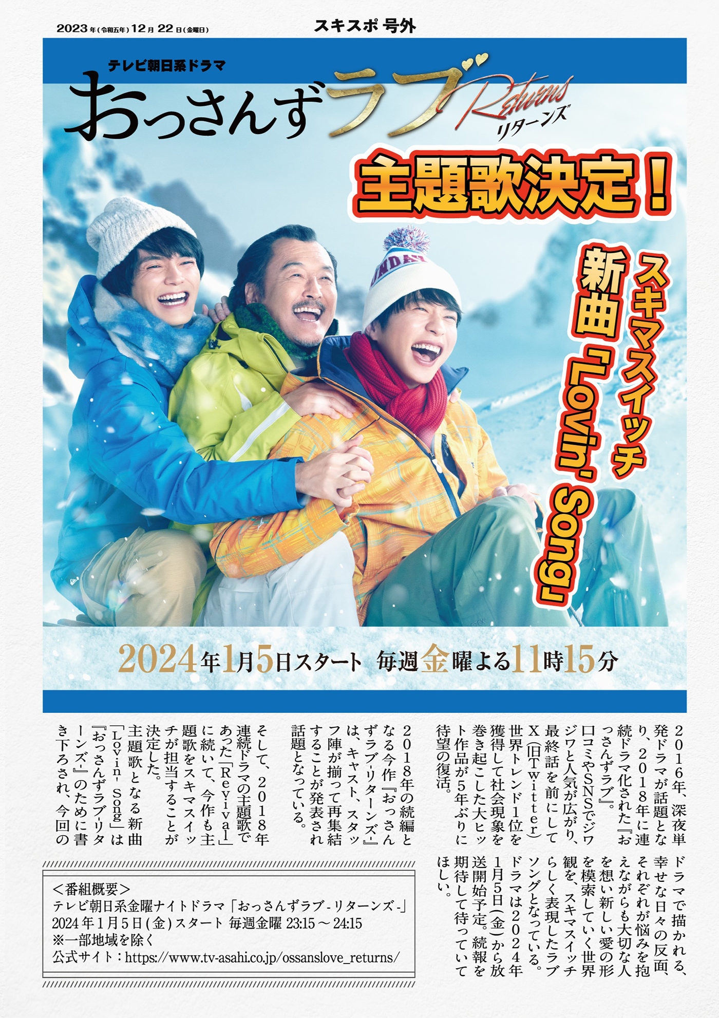 さらに、2024年1月5日から放送開始予定の、テレビ朝日系金曜ナイトドラマ『おっさんずラブ-リターンズ-』の主題歌をスキマスイッチが担当することが決定した。