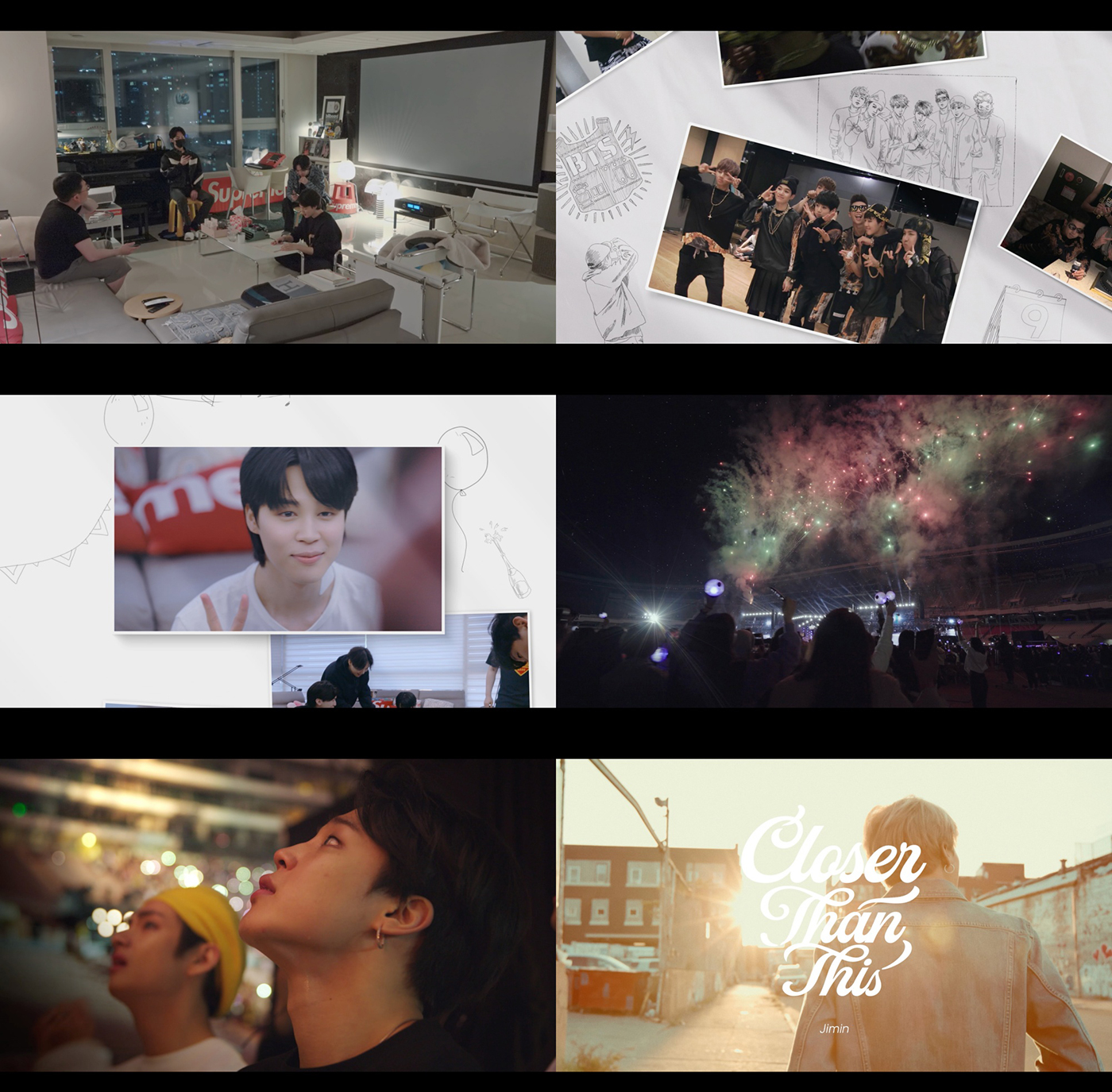 そして、「Closer Than This」ミュージックビデオには、JIMINが新曲を作業中の姿、BTSのデビュー当時のコンサートの映像、音楽アワードの授賞式の模様など、この10年間の忘れられない瞬間が盛り込まれ、思い出を刺激する。