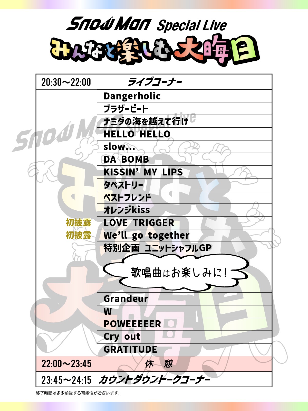 Snow Manが12月31日にYouTubeで行う生配信企画『Snow Man Special Live~みんなと楽しむ大晦日!~』のセットリストが公開された。