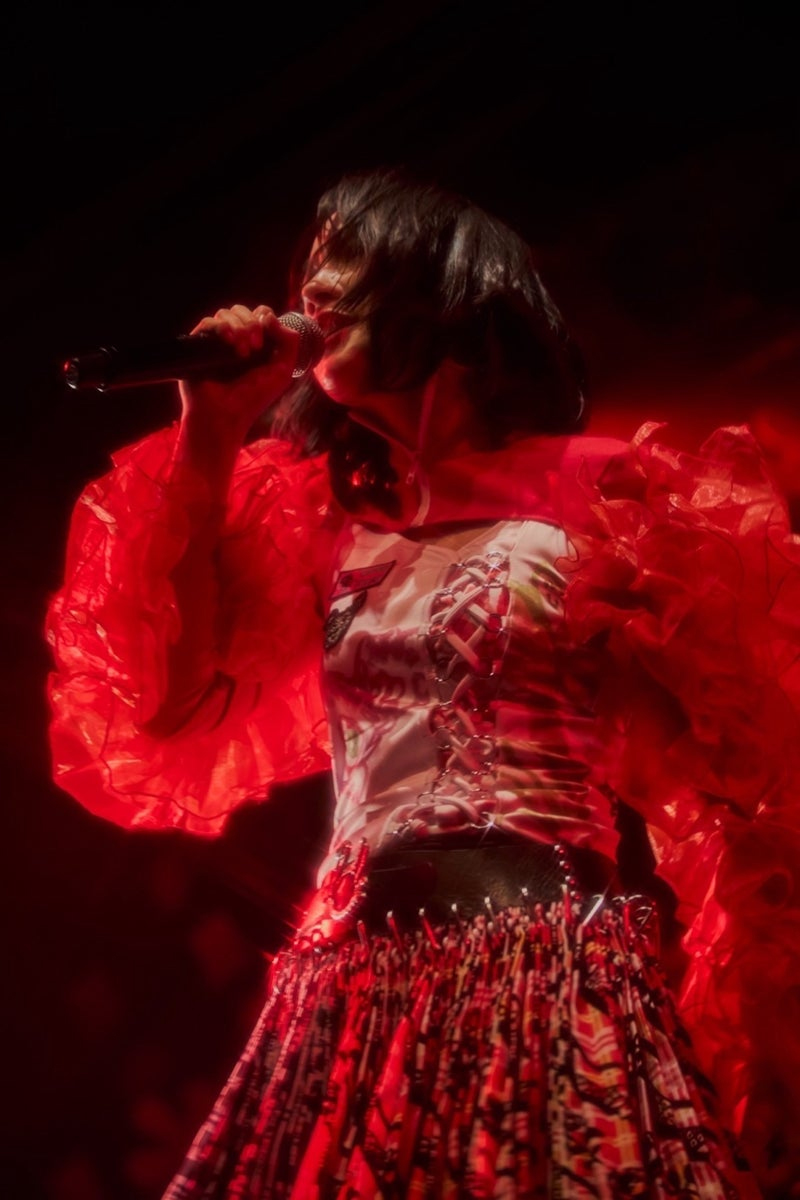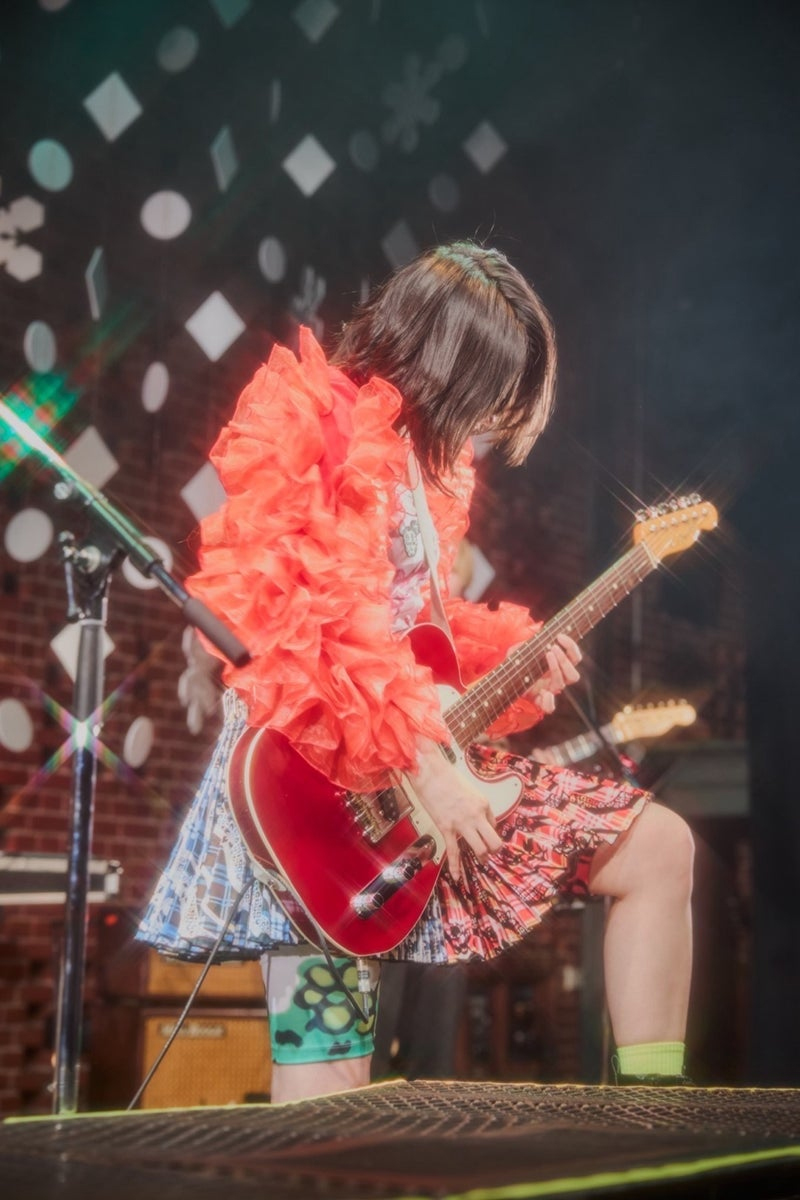 ■チェック柄のミニスカートに、袖に真っ赤なフリルがついたトップスを合わせた“ド派手”な衣装姿でステージに立って熱唱する姿やギターを弾く姿などを公開!