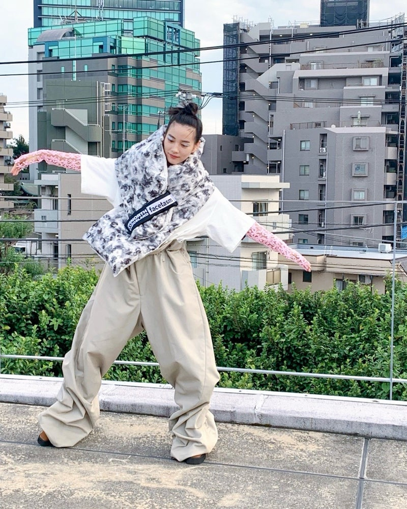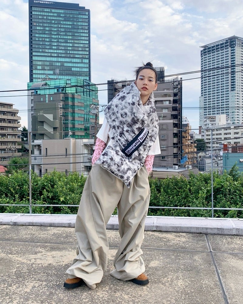 ■花柄ピンクのシースルートップスにオーバーサイズの白いTシャツ、大判なデザインが特徴的なモノクロカラーのダウンマフラー、ゆるっとしたパンツを合わせた新鮮で斬新なコーディネートを披露!