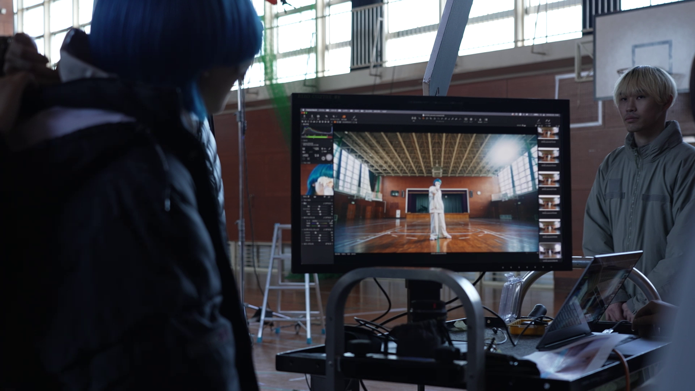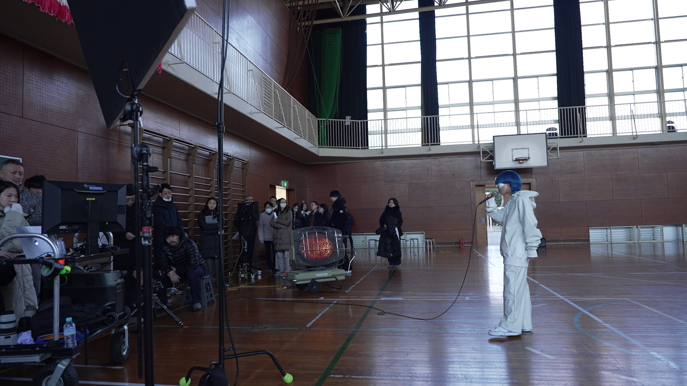 「#卒業希望式」のWeb CMに登場するのは、若者から絶大な人気を誇るアーティストのyama。撮影は、寒くてがらんと広い体育館でのグラフィック撮影からスタート。カメラの前でポーズを取るyamaは緊張しているのか、ぎこちない様子。しかし、マイクを持ち、yamaの楽曲を歌いながら撮影をはじめたところ、雰囲気ががらりと変わった。誰もいない体育館がまるでライブ会場のように熱を持ちはじめ、カメラマンも勢い付きシャッターを何度も切る撮影となった。