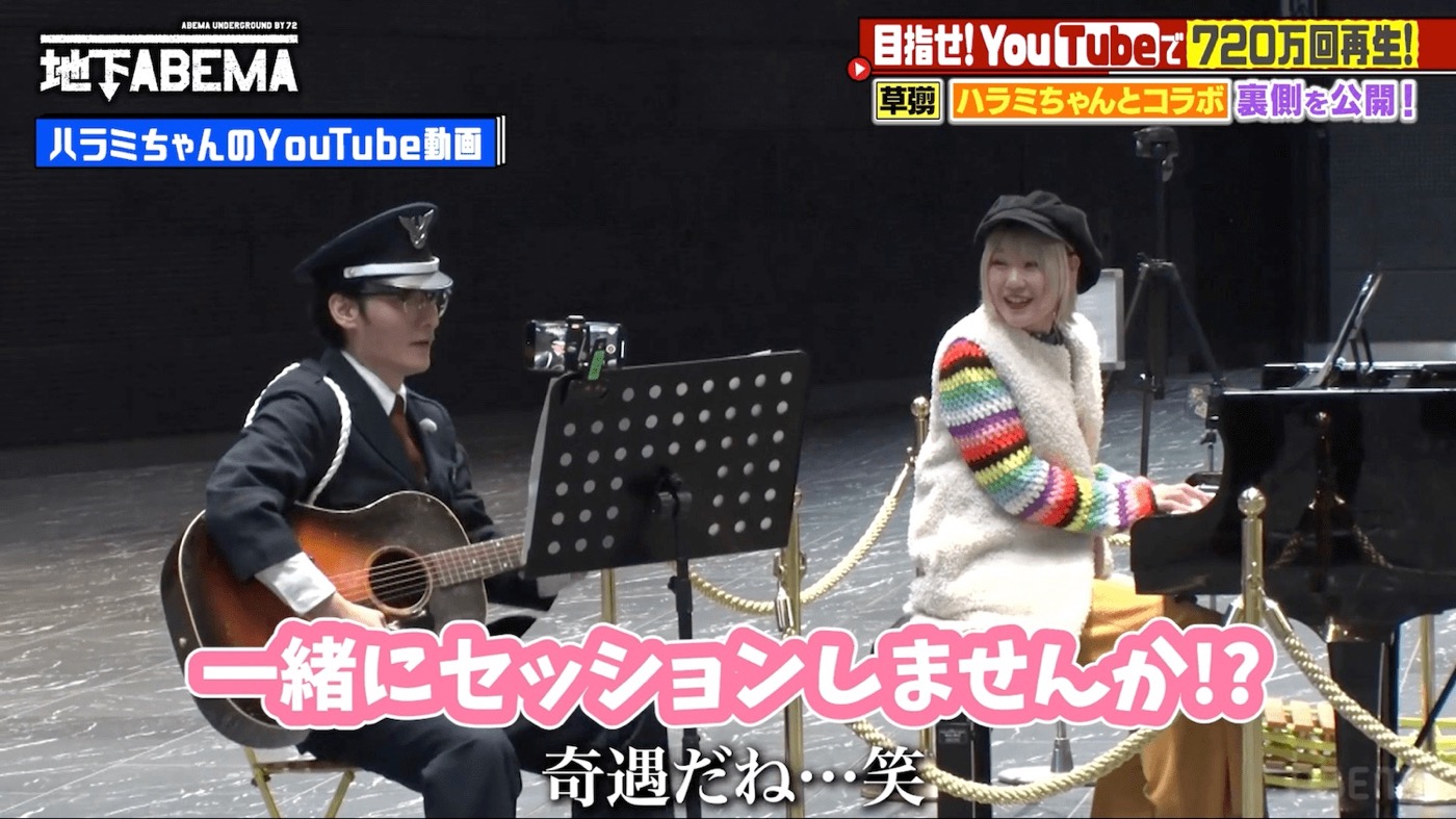 そして、いよいよお待ちかねの草なぎがハラミちゃんの演奏に乱入するターンに。ハラミちゃんが井上陽水の「夢の中へ」を演奏し始めると、マイギターを持った草なぎがやや緊張した面持ちで、ハラミちゃんの元へ向かう。するとリハーサルなしで、ハラミちゃんとセッションをスタート。初めこそタイミングが掴めず「どこから入るかわからないよ」と口にしていたものの、無事にサビで合流。その場に居合わせた観客は拍手喝采を送った。そこで帽子を取り、「草なぎ剛でーす!」と自身の正体を明かし、続いて、斉藤和義の「歩いて帰ろう」を完璧に演奏した。