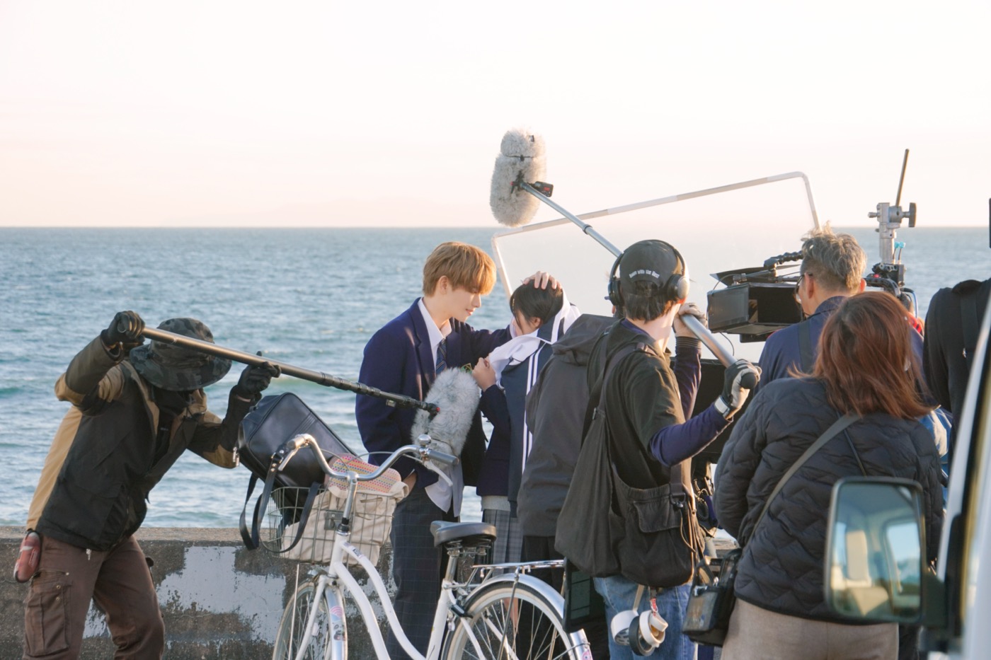さらに撮影の裏側に迫るメイキング写真も同時解禁。本シーンが撮影されたのは、対岸に江ノ島灯台を望む七里ヶ浜。絶好のロケーションである、陽光きらめく海原を背景に、名シーン“ジャージキス”をいかにロマンチックに実写化するか。キャスト・スタッフ全員が集中し、念入りに段取りを重ねていく。
