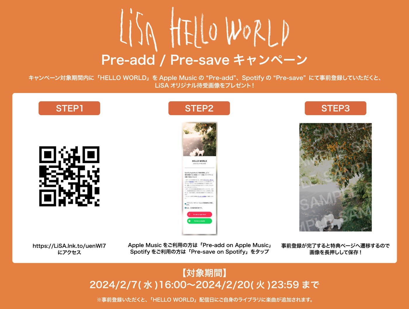現在「HELLO WORLD」のPre-add / Pre-saveキャンペーンが実施中。キャンペーン対象期間内に「HELLO WORLD」をApple Musicの“Pre-add”、Spotifyの“Pre-save”にて事前登録すると「LiSA オリジナル待受画像」がダウンロードできる。