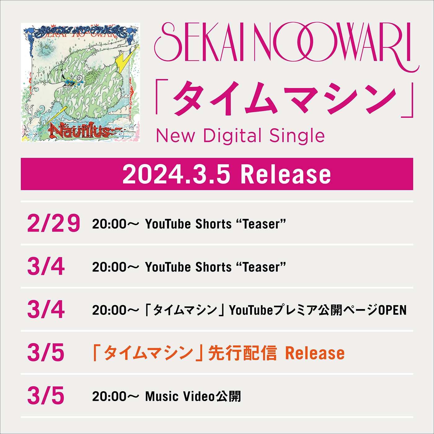 SEKAI NO OWARIが3月13日にリリースするニューアルバム『Nautilus』から、「タイムマシン」が3月5日から先行配信されることが決定した。