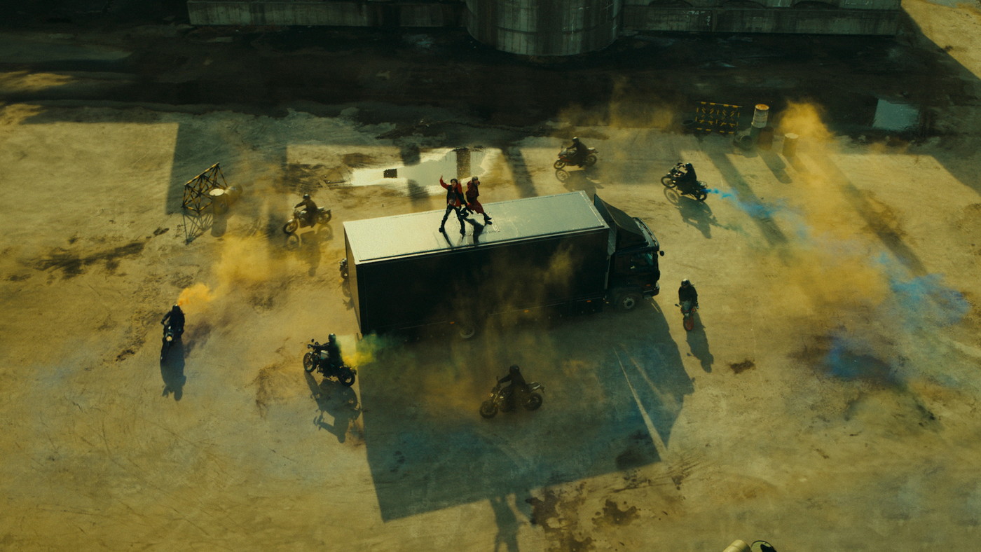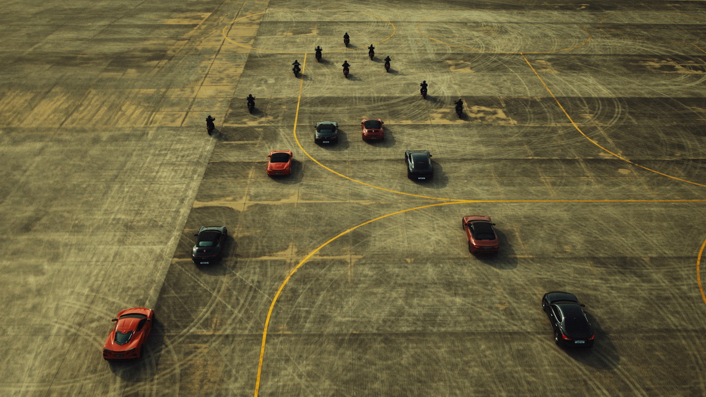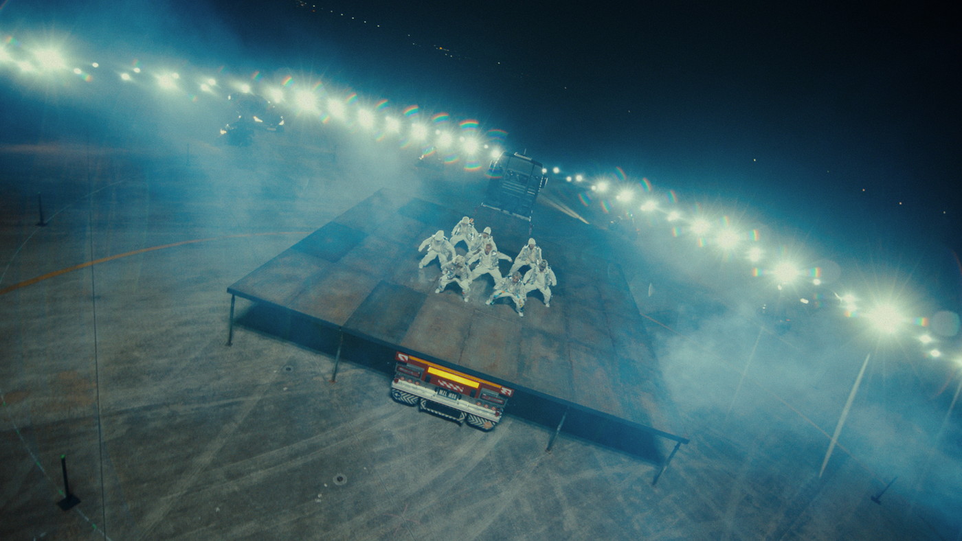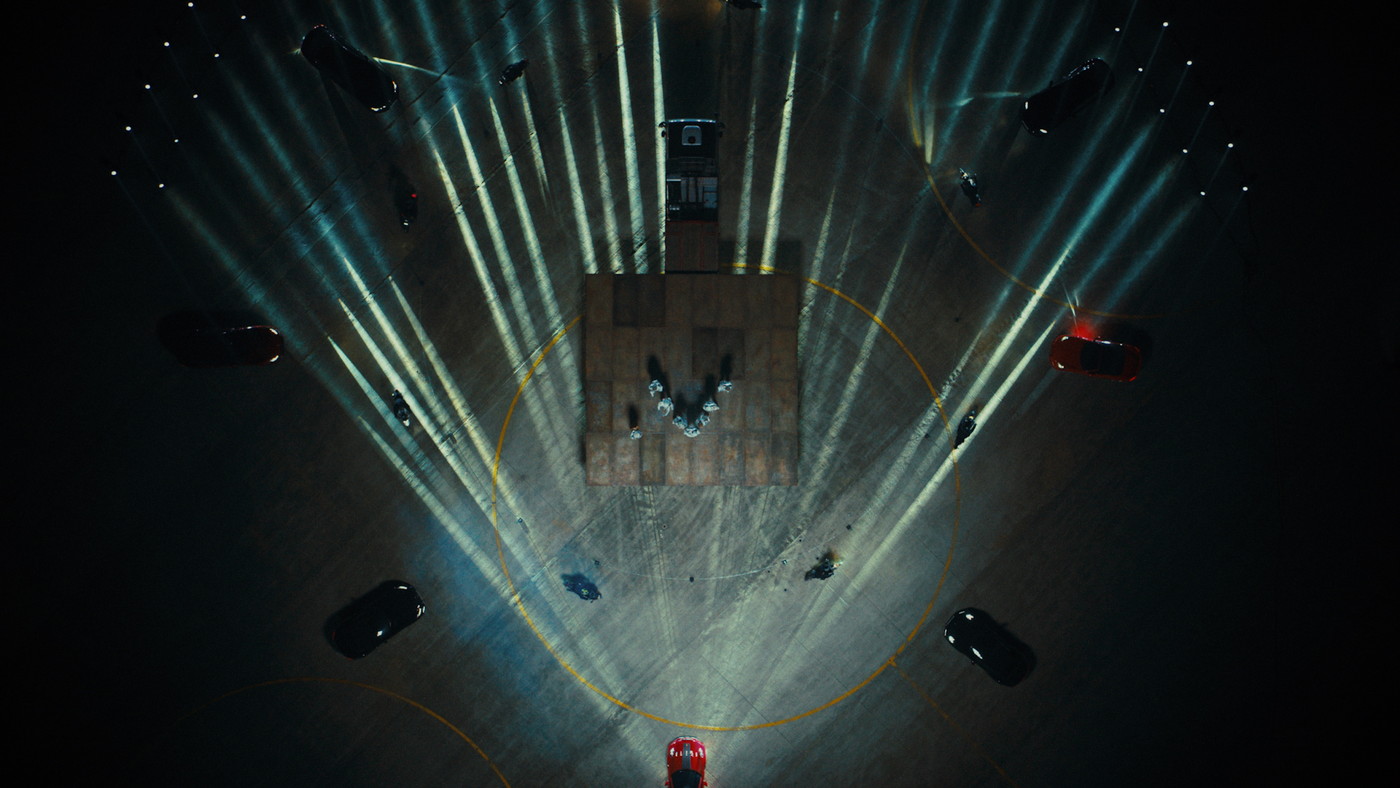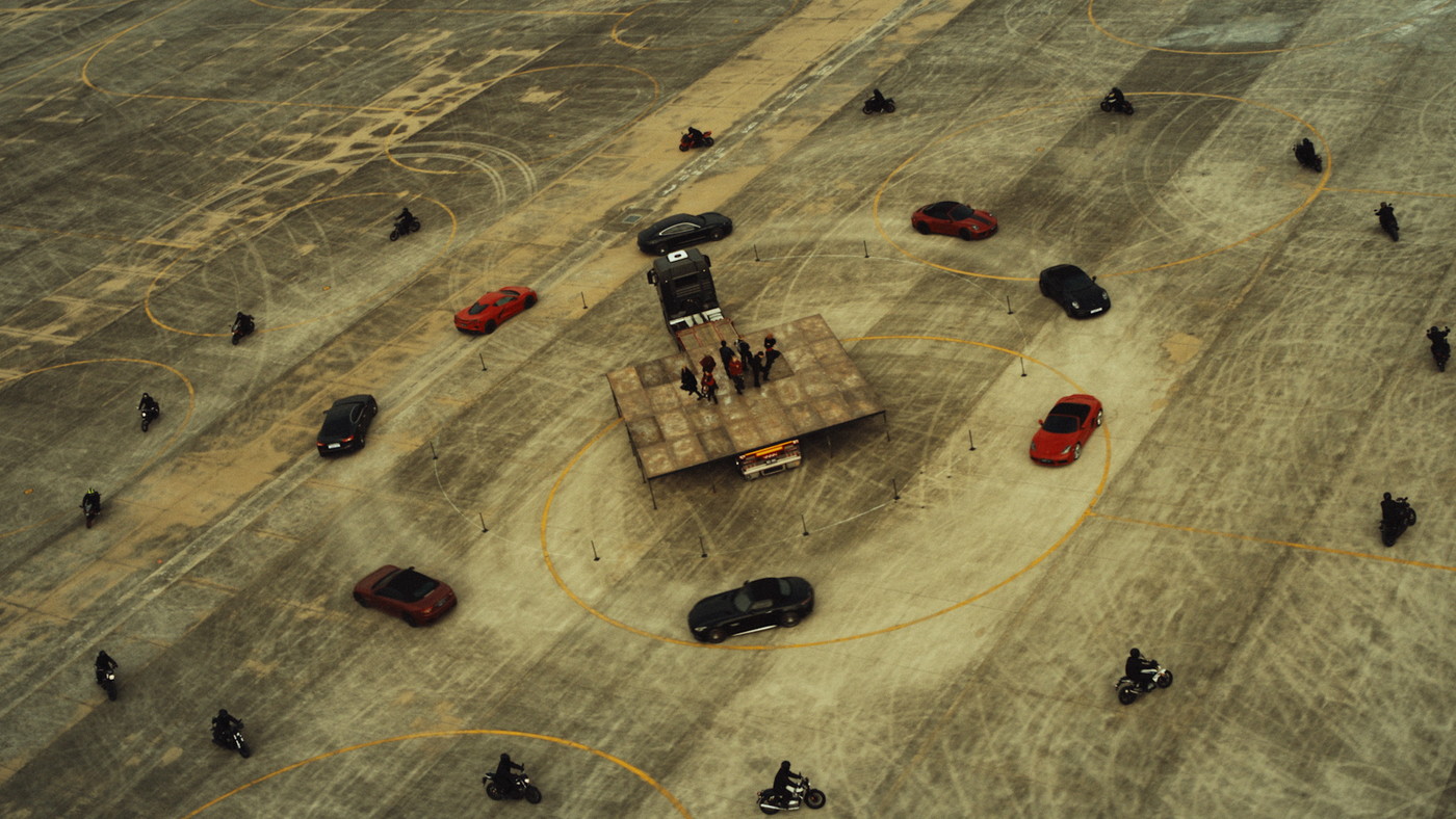 特に空撮シーンでは、メンバーが磁場となり、そこに引き寄せられた車とバイクが大きなうねりとなっていくような、魔法陣のように美しく大迫力の光景が展開される。