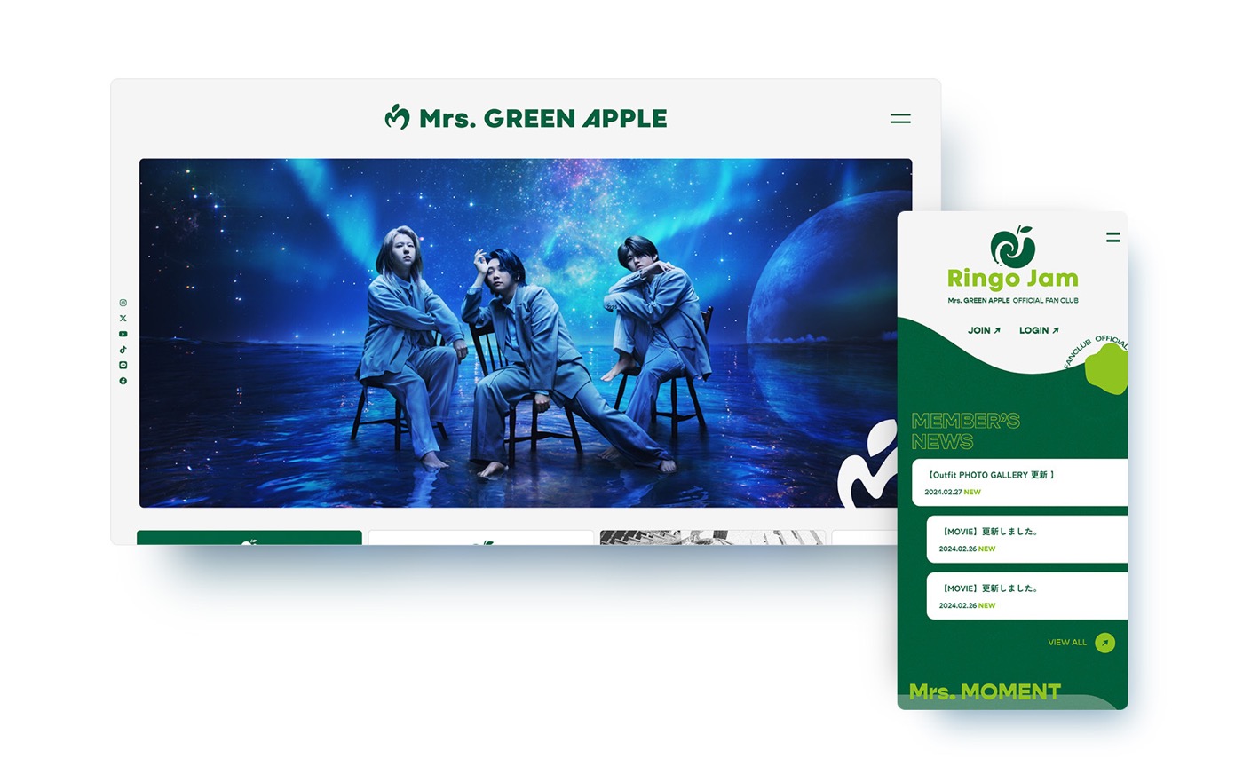 Mrs. GREEN APPLEのオフィシャルサイトおよびファンクラブ「Ringo Jam」が3月3日にフルリニューアルオープンした。