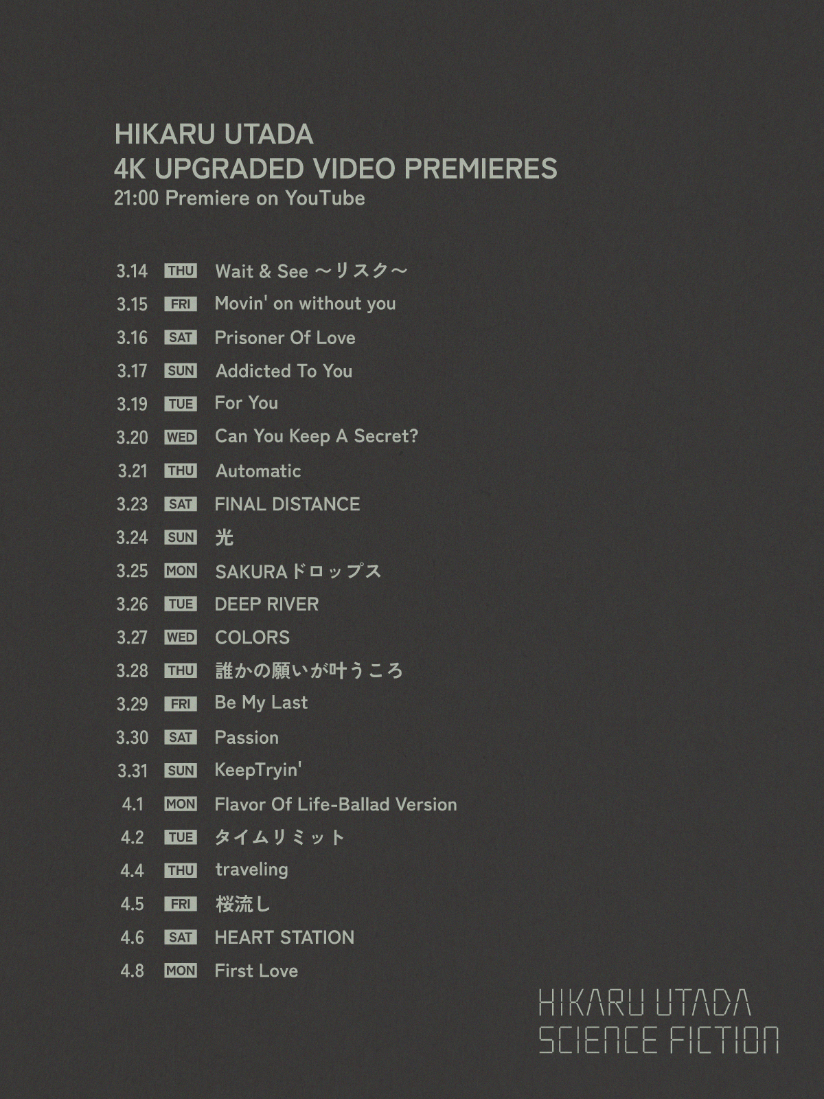 今回のキャンペーンでは、デビュー初期の楽曲「Automatic」「First Love」から、2016年に発表された「桜流し」までのMVを4K画質にアップコンバートした全22の映像作品をリリースまで連日、宇多田ヒカルのオフィシャルYouTubeでプレミア公開。