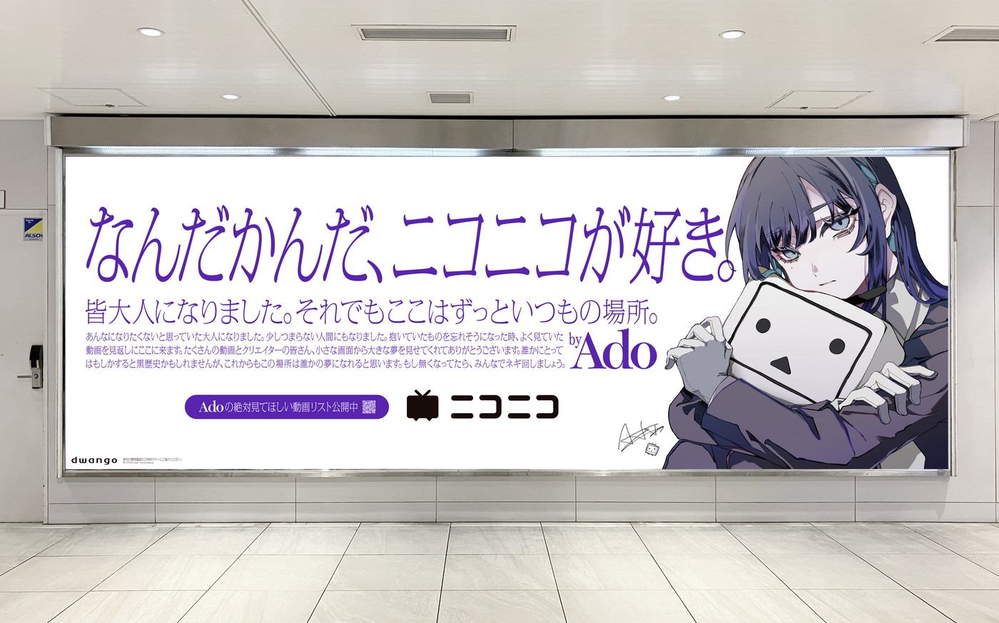 ニコニコ動画から歌い手として活動をスタートし、いまや世界で活躍しているAdoさんですが、今もいちユーザーとしてニコニコ動画を楽しんでいただいています。その様子はプロやアマチュアの垣根がない誰もが平等に楽しめるニコニコ動画そのものを体現されている方だと思い、今回の広告キャンペーンに起用させていただきました。Adoさんのメッセージやおすすめの動画を通して、まだニコニコ動画にふれたことがない方にも、体験していただくきっかけになればと思っています。(株式会社ドワンゴ 担当者)